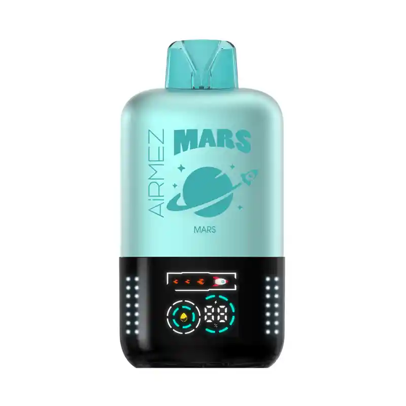 Mars: Moras azules con un toque fresco Presentamos el vaporizador desechable AiRMEZ Mars 20000 Puffs, un dispositivo innovador diseñado para llevar su experiencia de vapeo a nuevas alturas. Con una batería recargable integrada de 800 mAh, AiRMEZ Mars garantiza una energía duradera para sesiones prolongadas de vapeo. Con un notable recuento de inhalaciones de aproximadamente 20000 inhalaciones en modo regular y 10000 inhalaciones en modo Mars Enhanced Airflow. Este vaporizador desechable ofrece una longevidad excepcional. Experimente el futuro del vapeo con la primera pantalla orbital de 360 grados del mundo, que ofrece una interfaz futurista e intuitiva para una navegación perfecta, indicando tanto el nivel de bateria como de esencia restante. Mejorado con tecnología de bobina de malla dual, AiRMEZ Mars ofrece un sabor y una producción de vapor incomparables en cada calada. Características Indicador de duración de la batería Indicador de nivel de esencia Batería recargable integrada de 800 mAh. Diferentes modos de flujo de aire La primera pantalla orbital de 360 grados del mundo Bobina de malla doble 5% (50 mg) de concentración de nicotina Carga USB tipo C 2 modos de energía (moderado y fuerte)