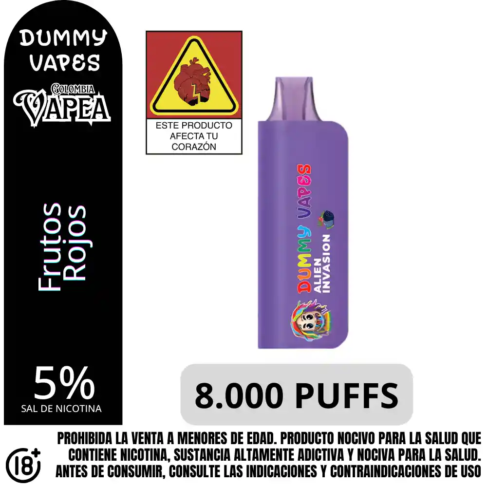 Vapeador Desechable marca Dummy sabor a Alien Invasion. Fuerza de nicotina: 5%. Sal de nicotina equivalente a aproximadamente 1 paquete de cigarrillos. Capacidad de la batería: 500 mAh. Número de bocanadas: hasta 8000 Puffs o caladas. Prohibida la venta a menores de edad. Producto nocivo para la salud que contiene nicotina, sustancia altamente adictiva. Antes de consumir consulte las indicaciones y contraindicaciones de uso.