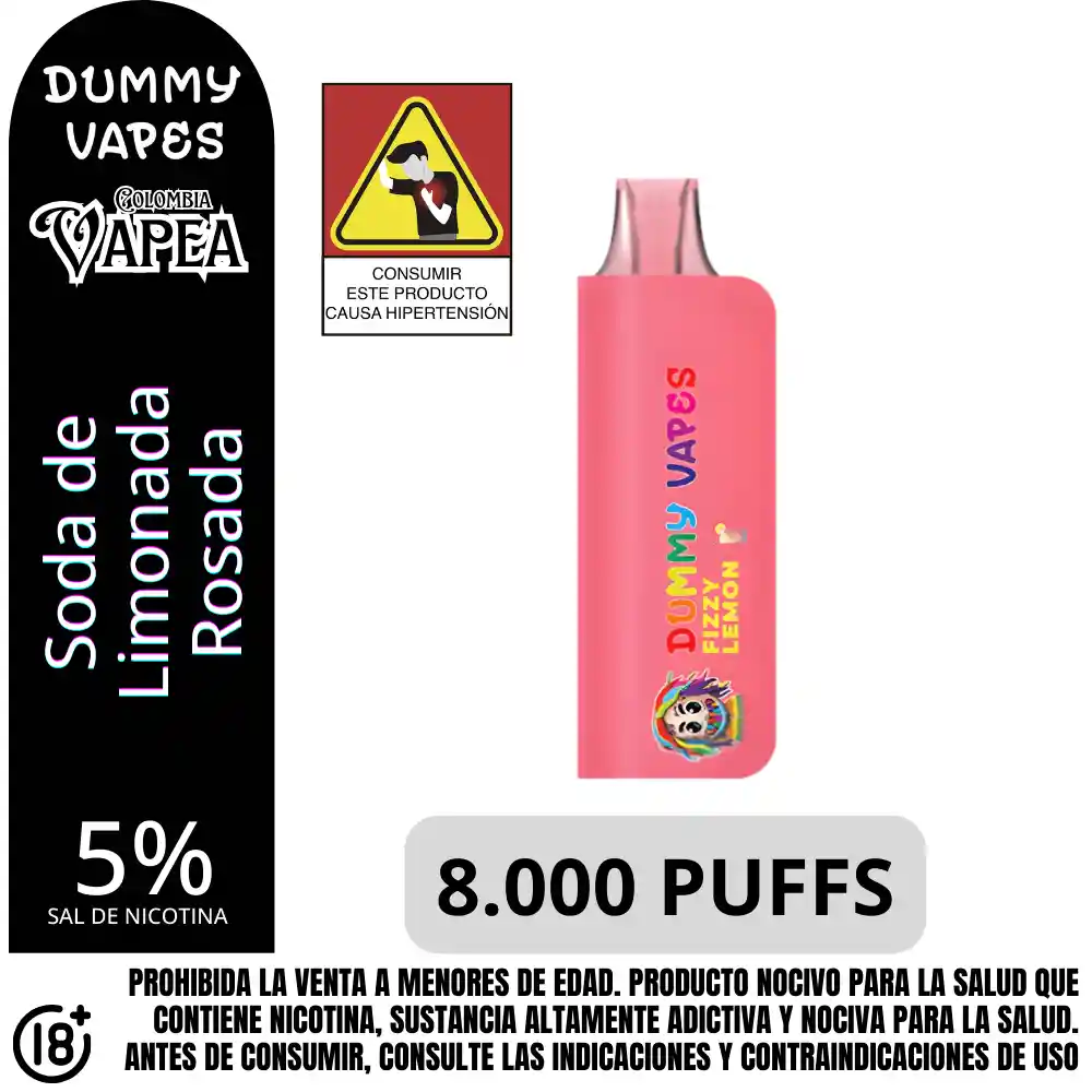 Vapeador Desechable marca Dummy sabor a Fizzy Lemon. Fuerza de nicotina: 5%. Sal de nicotina equivalente a aproximadamente 1 paquete de cigarrillos. Capacidad de la batería: 500 mAh. Número de bocanadas: hasta 8000 Puffs o caladas. Prohibida la venta a menores de edad. Producto nocivo para la salud que contiene nicotina, sustancia altamente adictiva. Antes de consumir consulte las indicaciones y contraindicaciones de uso.