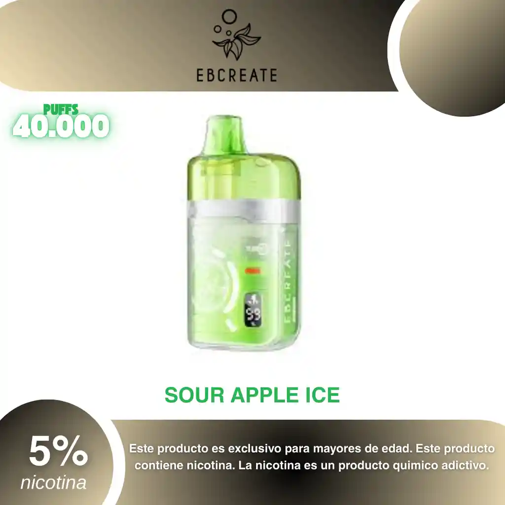 Ebcreate Bc Pro 40.00O Puffs, Sabor Manzana Verde 5% PROHIBIDA LA VENTA A MENORES DE EDAD. ADVERTENCIA: ESTE PRODUCTO CONTIENE NICOTINA, LA NICOTINA ES UNA SUSTANCIA QUIMICA ADICTIVA Y NOCIVA PARA LA SALUD. Los líquidos para vapeo contienen: propilenglicol USP, glicerina USP, sabor artificial y nicotina. Este producto puede contener nicotina, una sustancia altamente adictiva que puede generar dependencia, posibles afectaciones arteriales, cardiacas, pulmonares y otras aun no identificadas. No se recomienda su uso a mujeres en embarazo, puede generar lesiones al feto. Mantener alejado de niños y mascotas. No ingerir, puede generar irritación y/o intoxicación. Por favor antes de consumir consulte a su médico posibles afectaciones o sensibilidad a alguno de sus componentes. Los componentes de este producto pueden aumentar la sensación de ansiedad En caso de notar alguna reacción adversa por favor suspenda su uso de manera inmediata. Siga las instrucciones en el envase. No alterar sus componentes. Adquiera sus productos en sitios de confianza No use productos piratas, alterados, o en los cuales no pueda comprobar su buena procedencia, Verifique la reputación del fabricante y distribuidor antes de adquirir cualquier producto Si no es usuario fumador o vapeador no se recomienda su uso bajo ninguna circunstancia Al usar este producto usted es consciente que este producto puede generar afectaciones a su salud, incluyendo aquellas que a la fecha de la compra no se han identificado y que pueden aparecer a largo plazo