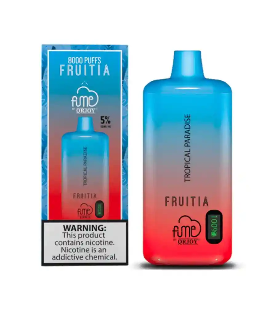 La exclusiva marca de e-Liquids Fruitia colabora con Fume Qrjoy en este nuevo dispositivo de 8000 puffs recargable y nuevos sabores. Vaporizador edicion especial Fume x Fruitia, con pantalla medidora de esencia y bateria, sabor FRUTAS TROPICALES, FRESA, COCO, Y PIÑA. Incluye Cable Cargador. 5%