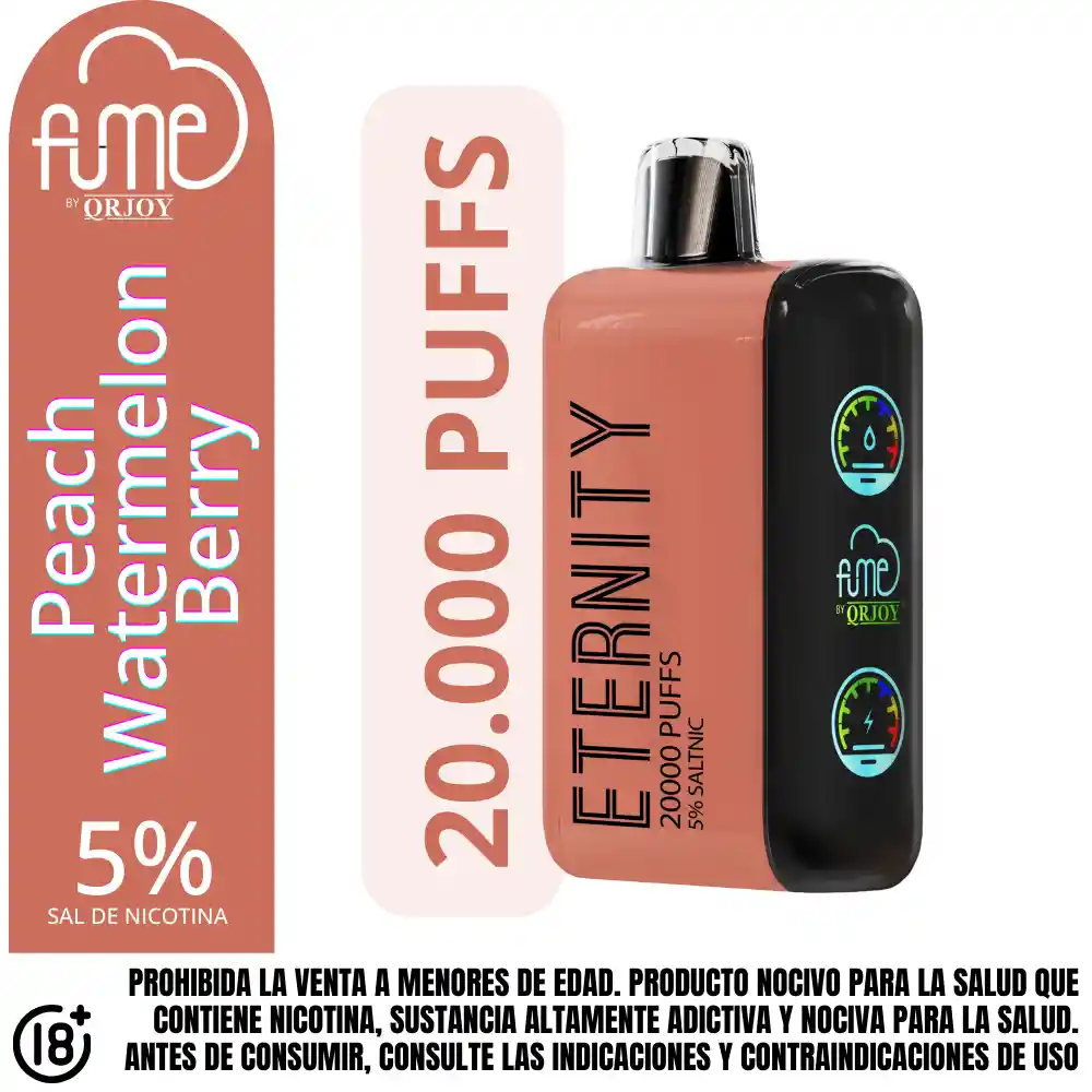 Vapeador Desechable marca Fume sabor a Peach Watermelon Berry. Fuerza de nicotina: 5%. Sal de nicotina equivalente a aproximadamente 1 paquete de cigarrillos. Capacidad de la batería: 700 mAh. Número de bocanadas: hasta 20000 Puffs o caladas. Prohibida la venta a menores de edad. Producto nocivo para la salud que contiene nicotina, sustancia altamente adictiva. Antes de consumir consulte las indicaciones y contraindicaciones de uso.