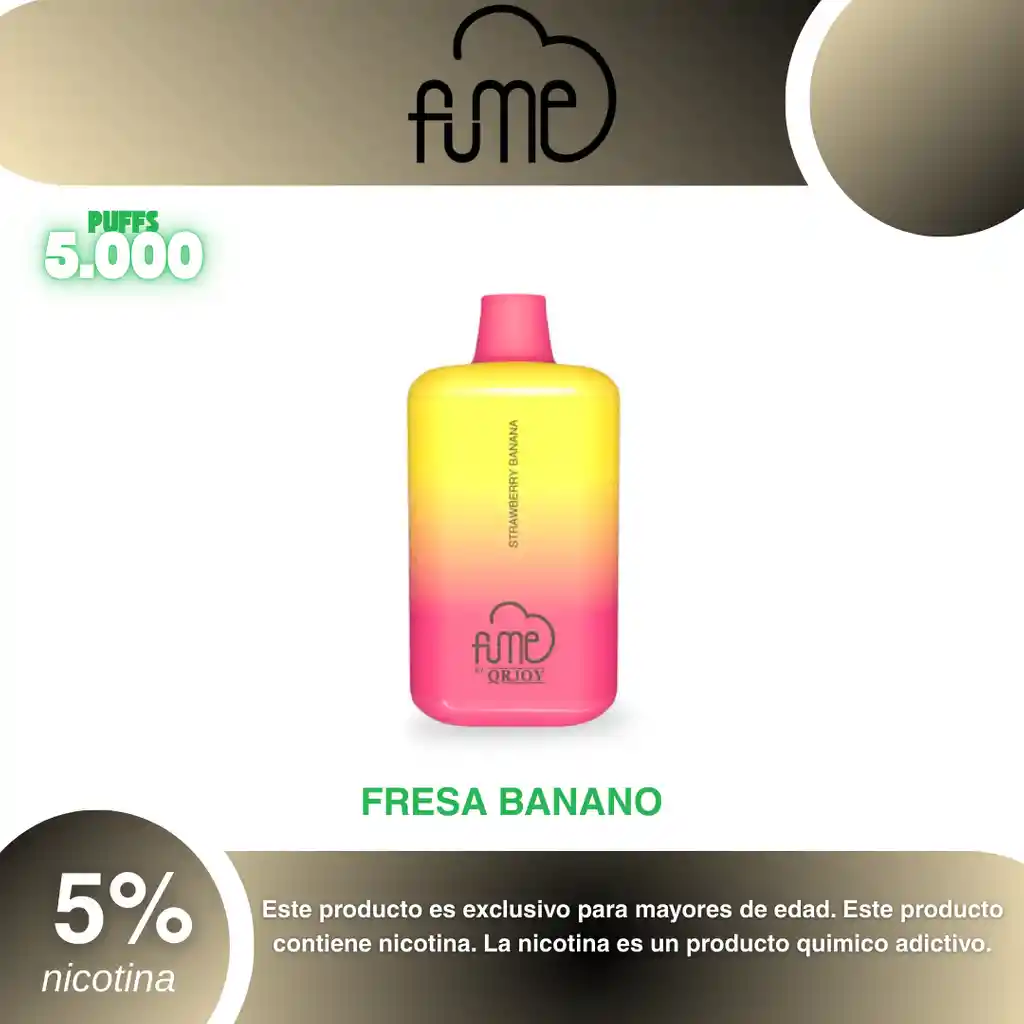 Fume Recharge 5.000 Puffs, Sabor Fresa Banano 5% PROHIBIDA LA VENTA A MENORES DE EDAD. ADVERTENCIA: ESTE PRODUCTO CONTIENE NICOTINA, LA NICOTINA ES UNA SUSTANCIA QUIMICA ADICTIVA Y NOCIVA PARA LA SALUD. Los líquidos para vapeo contienen: propilenglicol USP, glicerina USP, sabor artificial y nicotina. Este producto puede contener nicotina, una sustancia altamente adictiva que puede generar dependencia, posibles afectaciones arteriales, cardiacas, pulmonares y otras aun no identificadas. No se recomienda su uso a mujeres en embarazo, puede generar lesiones al feto. Mantener alejado de niños y mascotas. No ingerir, puede generar irritación y/o intoxicación. Por favor antes de consumir consulte a su médico posibles afectaciones o sensibilidad a alguno de sus componentes. Los componentes de este producto pueden aumentar la sensación de ansiedad En caso de notar alguna reacción adversa por favor suspenda su uso de manera inmediata. Siga las instrucciones en el envase. No alterar sus componentes. Adquiera sus productos en sitios de confianza No use productos piratas, alterados, o en los cuales no pueda comprobar su buena procedencia, Verifique la reputación del fabricante y distribuidor antes de adquirir cualquier producto Si no es usuario fumador o vapeador no se recomienda su uso bajo ninguna circunstancia Al usar este producto usted es consciente que este producto puede generar afectaciones a su salud, incluyendo aquellas que a la fecha de la compra no se han identificado y que pueden aparecer a largo plazo
