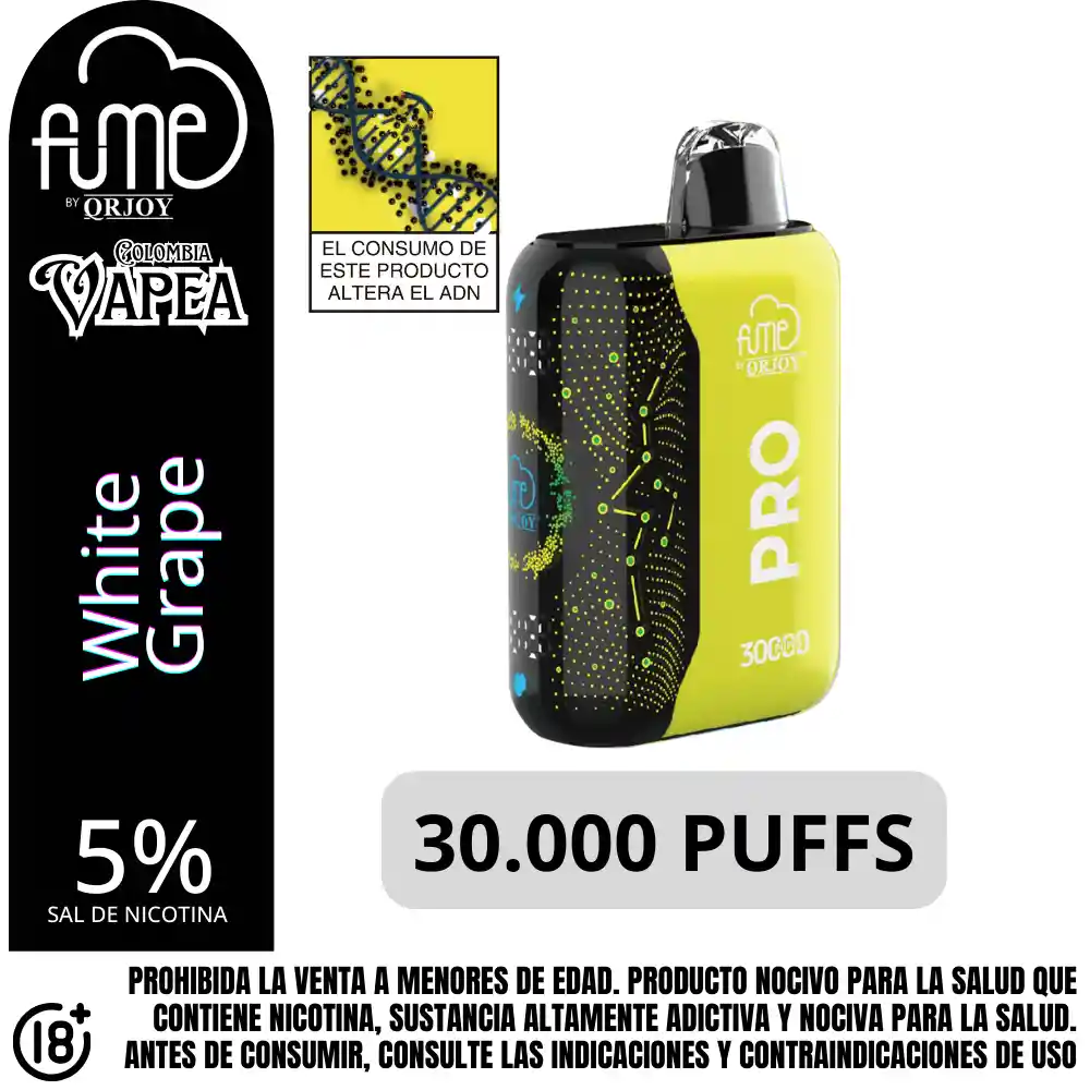 Vapeador Desechable marca Fume sabor a White Grape. Fuerza de nicotina: 5%. Sal de nicotina equivalente a aproximadamente 1 paquete de cigarrillos. Capacidad de la batería: 1050 mAh. Número de bocanadas: hasta 30000 Puffs o caladas. Prohibida la venta a menores de edad. Producto nocivo para la salud que contiene nicotina, sustancia altamente adictiva. Antes de consumir consulte las indicaciones y contraindicaciones de uso.