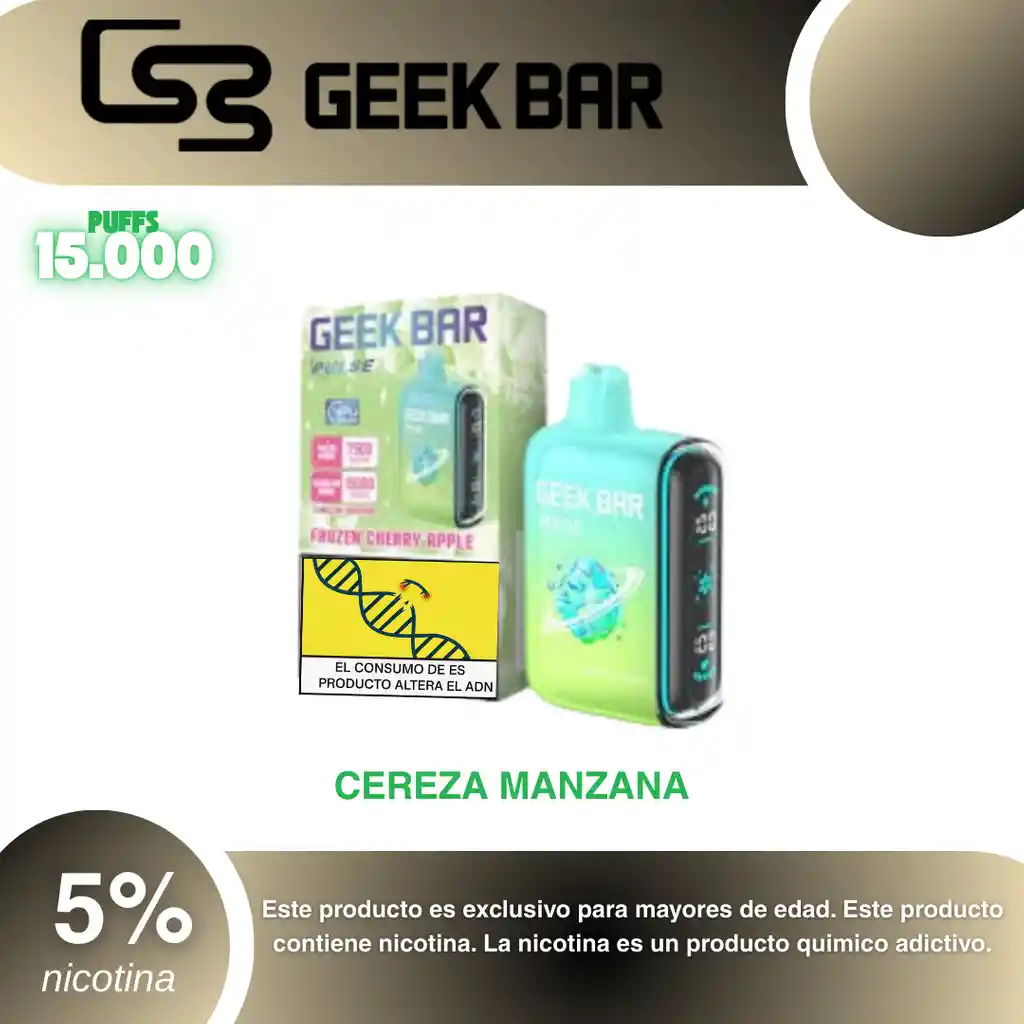 Geek Bar Pulse 15.000 Puffs, Sabor Cereza con Manzana Verde Montalada 5%. PROHIBIDA LA VENTA A MENORES DE EDAD. ADVERTENCIA: ESTE PRODUCTO CONTIENE NICOTINA, LA NICOTINA ES UNA SUSTANCIA QUIMICA ADICTIVA Y NOCIVA PARA LA SALUD. Los líquidos para vapeo contienen: propilenglicol USP, glicerina USP, sabor artificial y nicotina. Este producto puede contener nicotina, una sustancia altamente adictiva que puede generar dependencia, posibles afectaciones arteriales, cardiacas, pulmonares y otras aun no identificadas. No se recomienda su uso a mujeres en embarazo, puede generar lesiones al feto. Mantener alejado de niños y mascotas. No ingerir, puede generar irritación y/o intoxicación. Por favor antes de consumir consulte a su médico posibles afectaciones o sensibilidad a alguno de sus componentes. Los componentes de este producto pueden aumentar la sensación de ansiedad En caso de notar alguna reacción adversa por favor suspenda su uso de manera inmediata. Siga las instrucciones en el envase. No alterar sus componentes. Adquiera sus productos en sitios de confianza No use productos piratas, alterados, o en los cuales no pueda comprobar su buena procedencia, Verifique la reputación del fabricante y distribuidor antes de adquirir cualquier producto Si no es usuario fumador o vapeador no se recomienda su uso bajo ninguna circunstancia Al usar este producto usted es consciente que este producto puede generar afectaciones a su salud, incluyendo aquellas que a la fecha de la compra no se han identificado y que pueden aparecer a largo plazo.