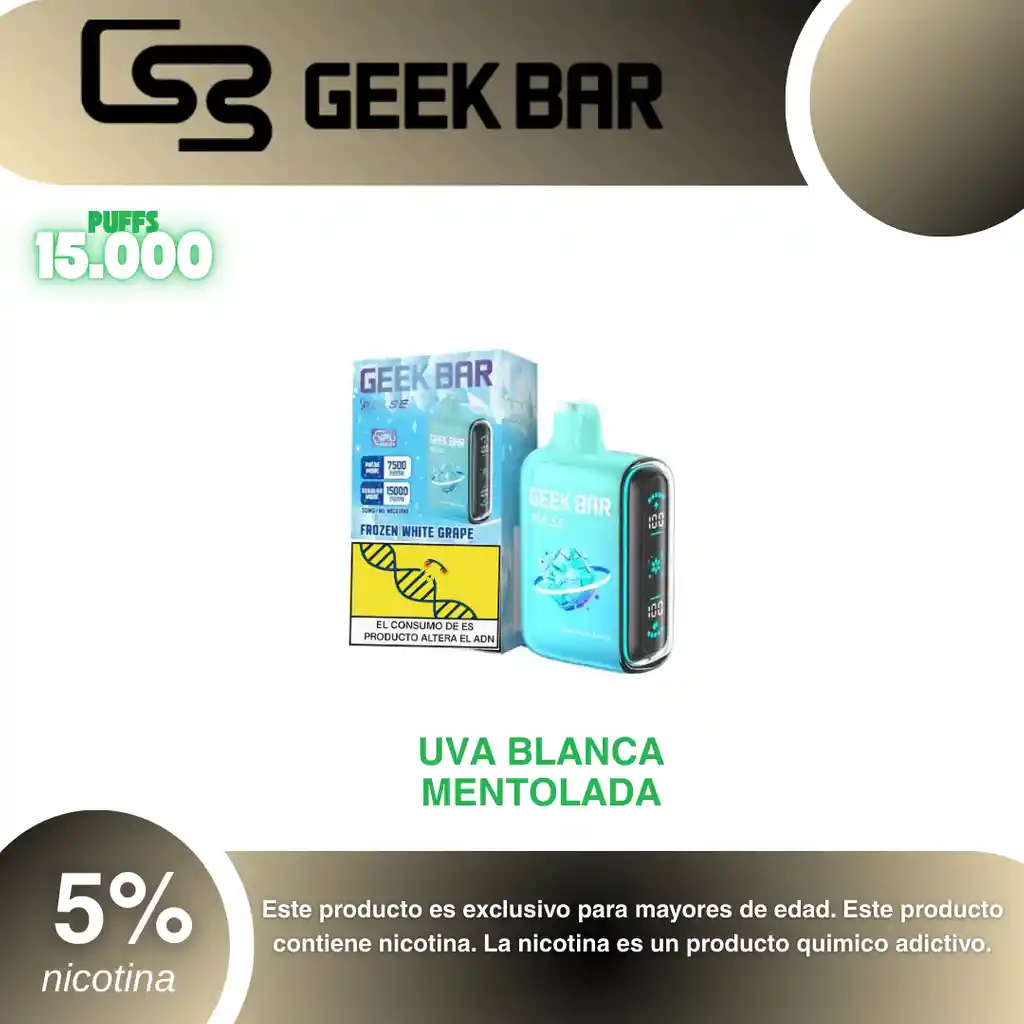 Geek Bar Pulse 15.000 Puffs, Sabor Uva Blanca Montolada 5%. PROHIBIDA LA VENTA A MENORES DE EDAD. ADVERTENCIA: ESTE PRODUCTO CONTIENE NICOTINA, LA NICOTINA ES UNA SUSTANCIA QUIMICA ADICTIVA Y NOCIVA PARA LA SALUD. Los líquidos para vapeo contienen: propilenglicol USP, glicerina USP, sabor artificial y nicotina. Este producto puede contener nicotina, una sustancia altamente adictiva que puede generar dependencia, posibles afectaciones arteriales, cardiacas, pulmonares y otras aun no identificadas. No se recomienda su uso a mujeres en embarazo, puede generar lesiones al feto. Mantener alejado de niños y mascotas. No ingerir, puede generar irritación y/o intoxicación. Por favor antes de consumir consulte a su médico posibles afectaciones o sensibilidad a alguno de sus componentes. Los componentes de este producto pueden aumentar la sensación de ansiedad En caso de notar alguna reacción adversa por favor suspenda su uso de manera inmediata. Siga las instrucciones en el envase. No alterar sus componentes. Adquiera sus productos en sitios de confianza No use productos piratas, alterados, o en los cuales no pueda comprobar su buena procedencia, Verifique la reputación del fabricante y distribuidor antes de adquirir cualquier producto Si no es usuario fumador o vapeador no se recomienda su uso bajo ninguna circunstancia Al usar este producto usted es consciente que este producto puede generar afectaciones a su salud, incluyendo aquellas que a la fecha de la compra no se han identificado y que pueden aparecer a largo plazo.