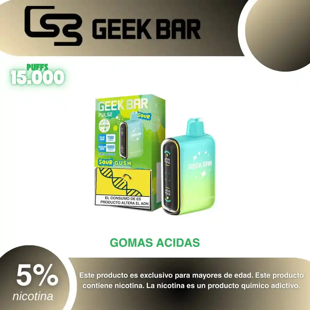 Geek Bar Pulse 15.000 Puffs, Sabor Fruta de Gomita 5% PROHIBIDA LA VENTA A MENORES DE EDAD. ADVERTENCIA: ESTE PRODUCTO CONTIENE NICOTINA, LA NICOTINA ES UNA SUSTANCIA QUIMICA ADICTIVA Y NOCIVA PARA LA SALUD. Los líquidos para vapeo contienen: propilenglicol USP, glicerina USP, sabor artificial y nicotina. Este producto puede contener nicotina, una sustancia altamente adictiva que puede generar dependencia, posibles afectaciones arteriales, cardiacas, pulmonares y otras aun no identificadas. No se recomienda su uso a mujeres en embarazo, puede generar lesiones al feto. Mantener alejado de niños y mascotas. No ingerir, puede generar irritación y/o intoxicación. Por favor antes de consumir consulte a su médico posibles afectaciones o sensibilidad a alguno de sus componentes. Los componentes de este producto pueden aumentar la sensación de ansiedad En caso de notar alguna reacción adversa por favor suspenda su uso de manera inmediata. Siga las instrucciones en el envase. No alterar sus componentes. Adquiera sus productos en sitios de confianza No use productos piratas, alterados, o en los cuales no pueda comprobar su buena procedencia, Verifique la reputación del fabricante y distribuidor antes de adquirir cualquier producto Si no es usuario fumador o vapeador no se recomienda su uso bajo ninguna circunstancia Al usar este producto usted es consciente que este producto puede generar afectaciones a su salud, incluyendo aquellas que a la fecha de la compra no se han identificado y que pueden aparecer a largo plazo