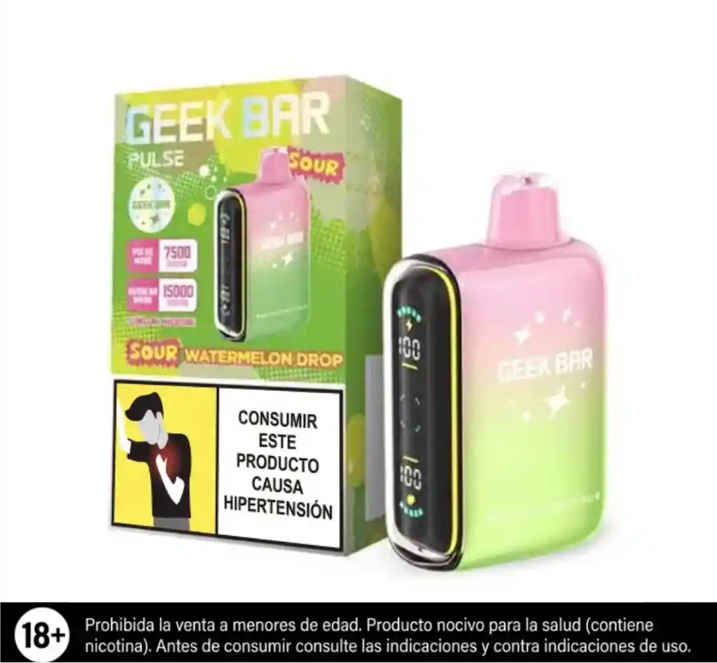 SANDIA ACIDA. Vaporizador desechable. Contiene 1 unidad con bateria recargable, recargado hasta con 15.000 puffs en modo regular y 7.500 puffs en modo Pulse. Nicotina 5% Producto exclusivo para mayores de edad, contiene nicotina, la nicotina es adictiva.