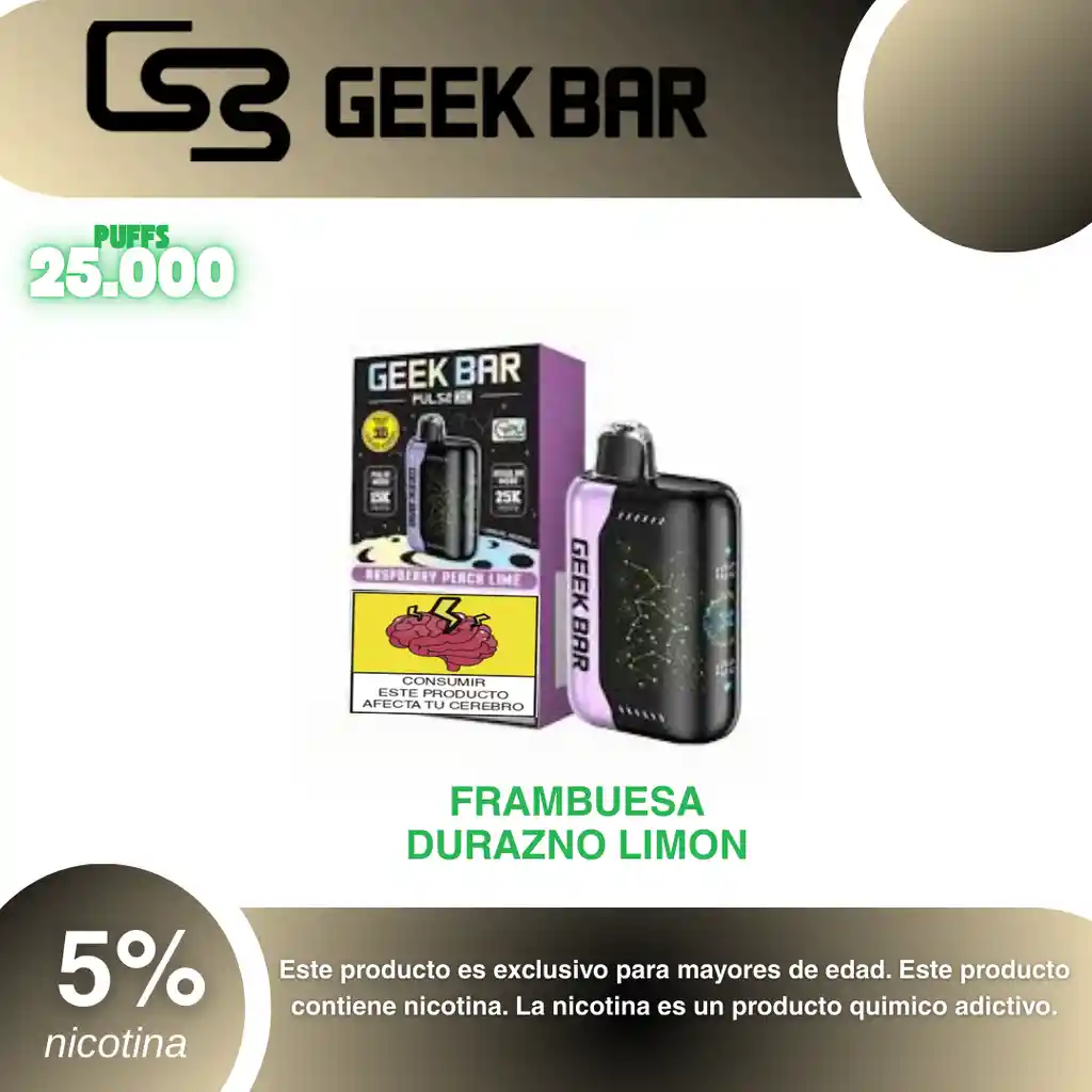 Geek Bar Pulse X 25.000 Puffs, Sabor Frambuesa, Durazno y Limon. PROHIBIDA LA VENTA A MENORES DE EDAD. ADVERTENCIA: ESTE PRODUCTO CONTIENE NICOTINA, LA NICOTINA ES UNA SUSTANCIA QUIMICA ADICTIVA Y NOCIVA PARA LA SALUD. Los líquidos para vapeo contienen: propilenglicol USP, glicerina USP, sabor artificial y nicotina. Este producto puede contener nicotina, una sustancia altamente adictiva que puede generar dependencia, posibles afectaciones arteriales, cardiacas, pulmonares y otras aun no identificadas. No se recomienda su uso a mujeres en embarazo, puede generar lesiones al feto. Mantener alejado de niños y mascotas. No ingerir, puede generar irritación y/o intoxicación. Por favor antes de consumir consulte a su médico posibles afectaciones o sensibilidad a alguno de sus componentes. Los componentes de este producto pueden aumentar la sensación de ansiedad En caso de notar alguna reacción adversa por favor suspenda su uso de manera inmediata. Siga las instrucciones en el envase. No alterar sus componentes. Adquiera sus productos en sitios de confianza No use productos piratas, alterados, o en los cuales no pueda comprobar su buena procedencia, Verifique la reputación del fabricante y distribuidor antes de adquirir cualquier producto Si no es usuario fumador o vapeador no se recomienda su uso bajo ninguna circunstancia Al usar este producto usted es consciente que este producto puede generar afectaciones a su salud, incluyendo aquellas que a la fecha de la compra no se han identificado y que pueden aparecer a largo plazo.