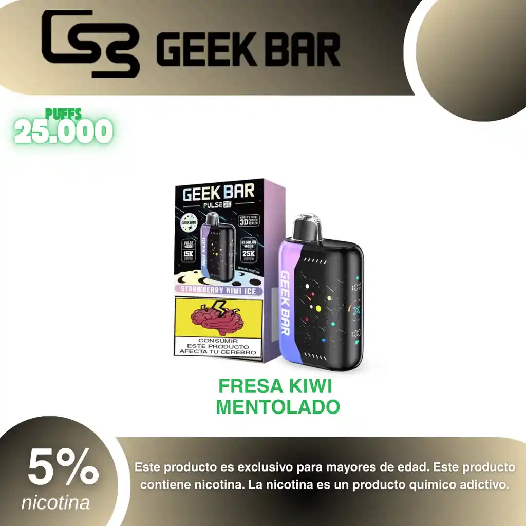 Geek Bar Pulse X 25.000 Puffs, Sabor Fresa Kiwi 5% PROHIBIDA LA VENTA A MENORES DE EDAD. ADVERTENCIA: ESTE PRODUCTO CONTIENE NICOTINA, LA NICOTINA ES UNA SUSTANCIA QUIMICA ADICTIVA Y NOCIVA PARA LA SALUD. Los líquidos para vapeo contienen: propilenglicol USP, glicerina USP, sabor artificial y nicotina. Este producto puede contener nicotina, una sustancia altamente adictiva que puede generar dependencia, posibles afectaciones arteriales, cardiacas, pulmonares y otras aun no identificadas. No se recomienda su uso a mujeres en embarazo, puede generar lesiones al feto. Mantener alejado de niños y mascotas. No ingerir, puede generar irritación y/o intoxicación. Por favor antes de consumir consulte a su médico posibles afectaciones o sensibilidad a alguno de sus componentes. Los componentes de este producto pueden aumentar la sensación de ansiedad En caso de notar alguna reacción adversa por favor suspenda su uso de manera inmediata. Siga las instrucciones en el envase. No alterar sus componentes. Adquiera sus productos en sitios de confianza No use productos piratas, alterados, o en los cuales no pueda comprobar su buena procedencia, Verifique la reputación del fabricante y distribuidor antes de adquirir cualquier producto Si no es usuario fumador o vapeador no se recomienda su uso bajo ninguna circunstancia Al usar este producto usted es consciente que este producto puede generar afectaciones a su salud, incluyendo aquellas que a la fecha de la compra no se han identificado y que pueden aparecer a largo plazo