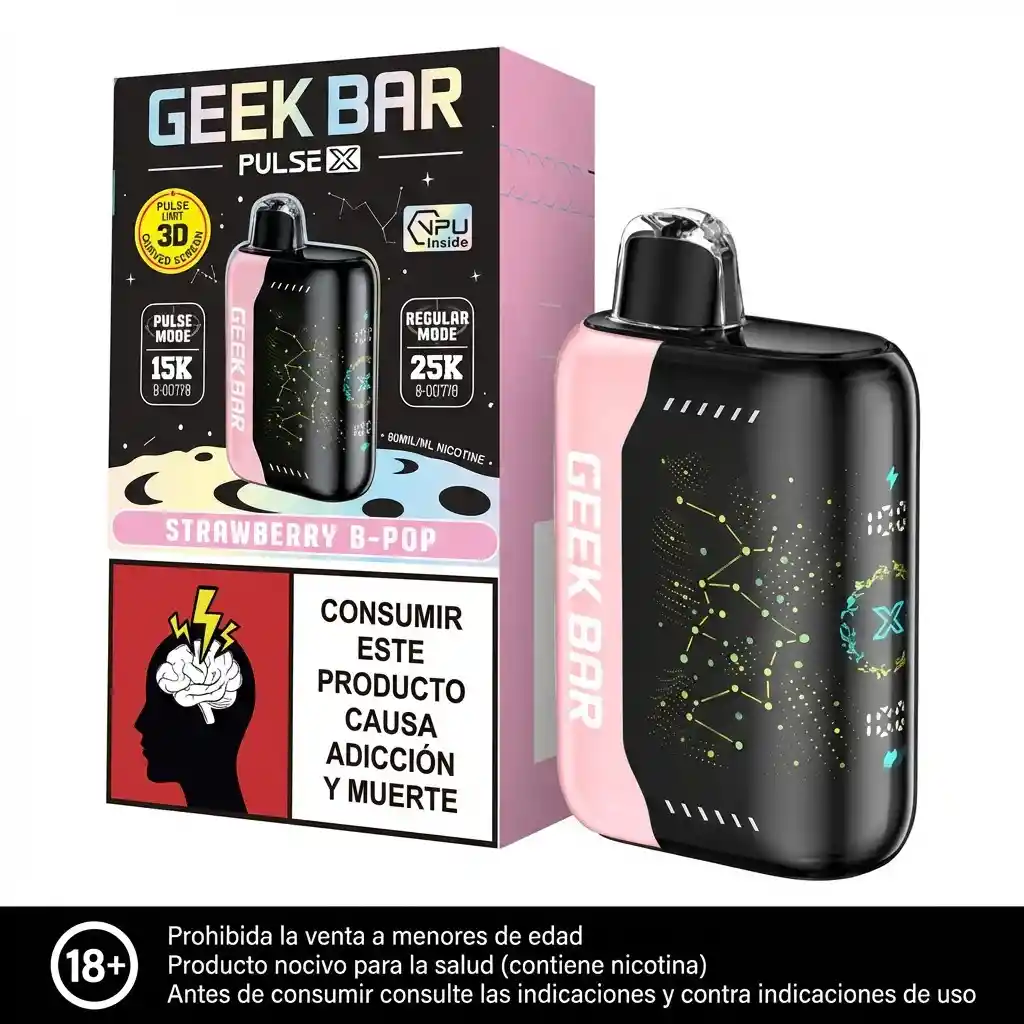 FRESA DULCE. Vaporizador desechable. Contiene 1 unidad con bateria recargable, recargado hasta con 25.000 puffs en modo regular y 15.000 puffs en modo Pulse X. Nicotina 5% Producto exclusivo para mayores de edad, contiene nicotina, la nicotina es adictiva.