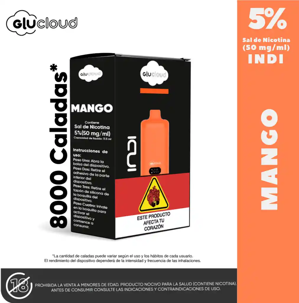 Vape GluCloud INDI Sabor Mango 8000 puffs recargable CON PANTALLA, MEDIDOR DE ESENCIA Y DE BATERIA, excelente sabor y calidad, 5%