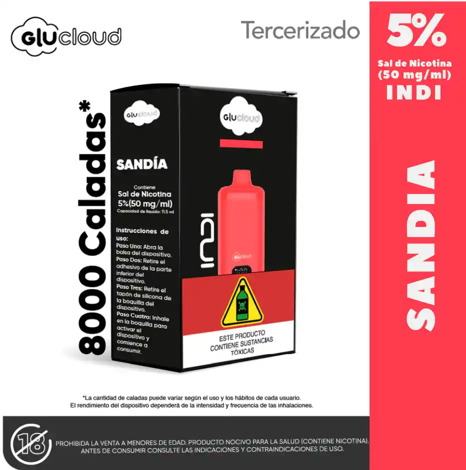 Vape GluCloud INDI Sabor Watermelon Ice 8000 puffs recargable CON PANTALLA, MEDIDOR DE ESENCIA Y DE BATERIA, excelente sabor y calidad, 5%
