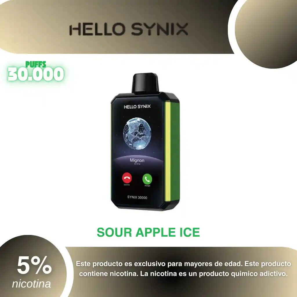 Vape Hello Synix 30.000 Puffs, Sabor Manzana Verde Mentolada 5% PROHIBIDA LA VENTA A MENORES DE EDAD. ADVERTENCIA: ESTE PRODUCTO CONTIENE NICOTINA, LA NICOTINA ES UNA SUSTANCIA QUIMICA ADICTIVA Y NOCIVA PARA LA SALUD. Los líquidos para vapeo contienen: propilenglicol USP, glicerina USP, sabor artificial y nicotina. Este producto puede contener nicotina, una sustancia altamente adictiva que puede generar dependencia, posibles afectaciones arteriales, cardiacas, pulmonares y otras aun no identificadas. No se recomienda su uso a mujeres en embarazo, puede generar lesiones al feto. Mantener alejado de niños y mascotas. No ingerir, puede generar irritación y/o intoxicación. Por favor antes de consumir consulte a su médico posibles afectaciones o sensibilidad a alguno de sus componentes. Los componentes de este producto pueden aumentar la sensación de ansiedad En caso de notar alguna reacción adversa por favor suspenda su uso de manera inmediata. Siga las instrucciones en el envase. No alterar sus componentes. Adquiera sus productos en sitios de confianza No use productos piratas, alterados, o en los cuales no pueda comprobar su buena procedencia, Verifique la reputación del fabricante y distribuidor antes de adquirir cualquier producto Si no es usuario fumador o vapeador no se recomienda su uso bajo ninguna circunstancia Al usar este producto usted es consciente que este producto puede generar afectaciones a su salud, incluyendo aquellas que a la fecha de la compra no se han identificado y que pueden aparecer a largo plazo