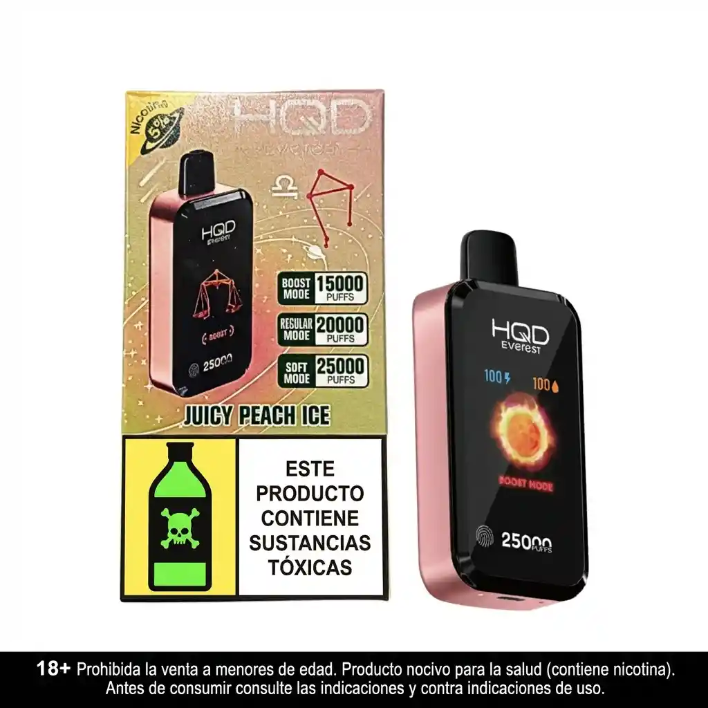 DURAZNO MENTOLADO. El HQD Everest 25000 es un vape desechable de alta capacidad con pantalla tactil, 3 niveles de potencia, diseñado para brindar una experiencia duradera y satisfactoria. Con una impresionante capacidad de 25 000 inhalaciones, este dispositivo es ideal para aquellos que buscan un vapeo prolongado sin necesidad de recargar o reemplazar cartuchos. El diseño compacto y ergonómico lo hace fácil de llevar, y su sistema de flujo de aire suave proporciona una experiencia de vapeo cómoda.