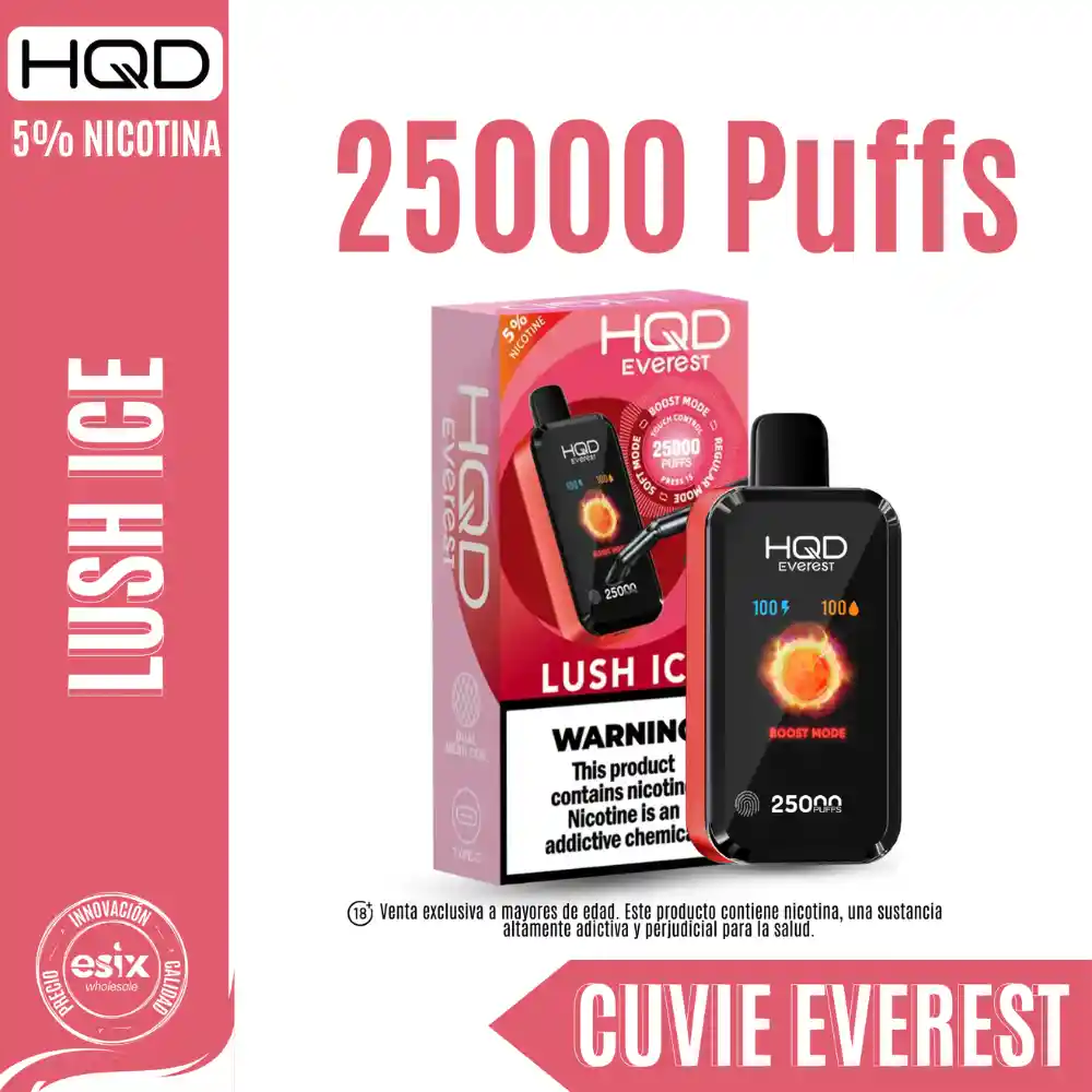 Vapeador Desechable marca HQD sabor a Lush Ice. Fuerza de nicotina: 5%. Sal de nicotina equivalente a aproximadamente 1 paquete de cigarrillos. Capacidad de la batería: 850 mAh. Número de bocanadas: hasta 25000 Puffs o caladas. Prohibida la venta a menores de edad. Producto nocivo para la salud que contiene nicotina, sustancia altamente adictiva. Antes de consumir consulte las indicaciones y contraindicaciones de uso.