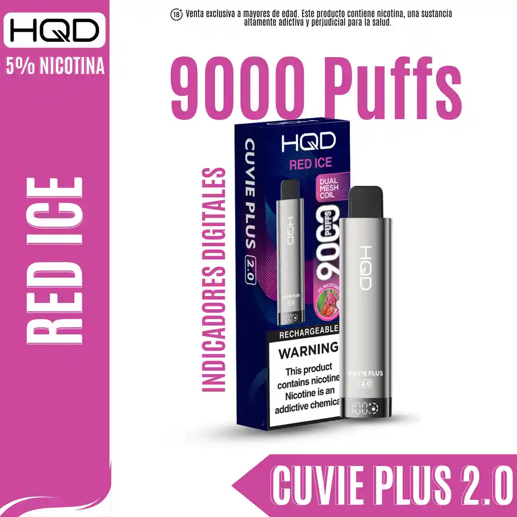 Vapeador Desechable marca HQD sabor a Red Ice. Fuerza de nicotina: 5%. Bolsa de nicotina de administración oral equivalente a aproximadamente 1 paquete de cigarrillos. Prohibida la venta a menores de edad. Producto nocivo para la salud que contiene nicotina, sustancia altamente adictiva. Antes de consumir consulte las indicaciones y contraindicaciones de uso.
