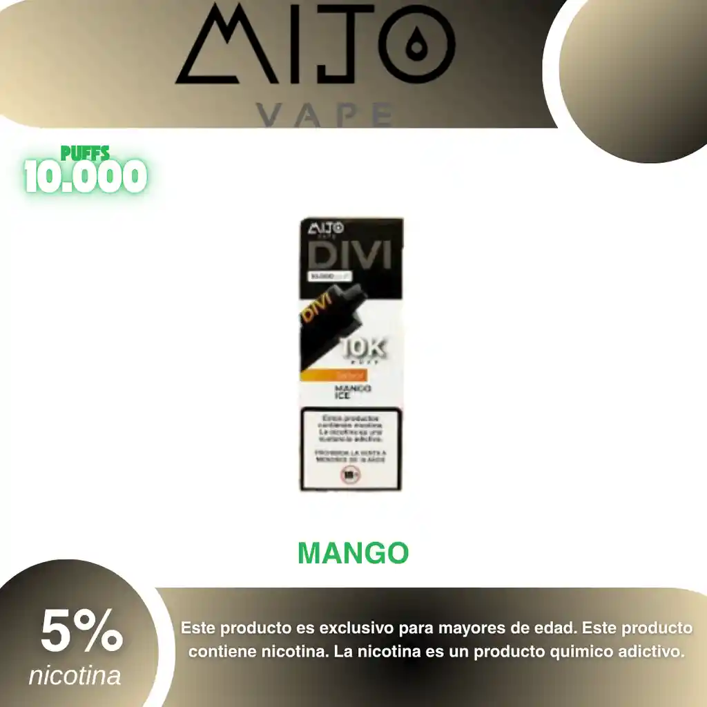 Mijo Divi 10.000 Puffs Mango 5% PROHIBIDA LA VENTA A MENORES DE EDAD. ADVERTENCIA: ESTE PRODUCTO CONTIENE NICOTINA, LA NICOTINA ES UNA SUSTANCIA QUIMICA ADICTIVA Y NOCIVA PARA LA SALUD. Los líquidos para vapeo contienen: propilenglicol USP, glicerina USP, sabor artificial y nicotina. Este producto puede contener nicotina, una sustancia altamente adictiva que puede generar dependencia, posibles afectaciones arteriales, cardiacas, pulmonares y otras aun no identificadas. No se recomienda su uso a mujeres en embarazo, puede generar lesiones al feto. Mantener alejado de niños y mascotas. No ingerir, puede generar irritación y/o intoxicación. Por favor antes de consumir consulte a su médico posibles afectaciones o sensibilidad a alguno de sus componentes. Los componentes de este producto pueden aumentar la sensación de ansiedad En caso de notar alguna reacción adversa por favor suspenda su uso de manera inmediata. Siga las instrucciones en el envase. No alterar sus componentes. Adquiera sus productos en sitios de confianza No use productos piratas, alterados, o en los cuales no pueda comprobar su buena procedencia, Verifique la reputación del fabricante y distribuidor antes de adquirir cualquier producto Si no es usuario fumador o vapeador no se recomienda su uso bajo ninguna circunstancia Al usar este producto usted es consciente que este producto puede generar afectaciones a su salud, incluyendo aquellas que a la fecha de la compra no se han identificado y que pueden aparecer a largo plazo