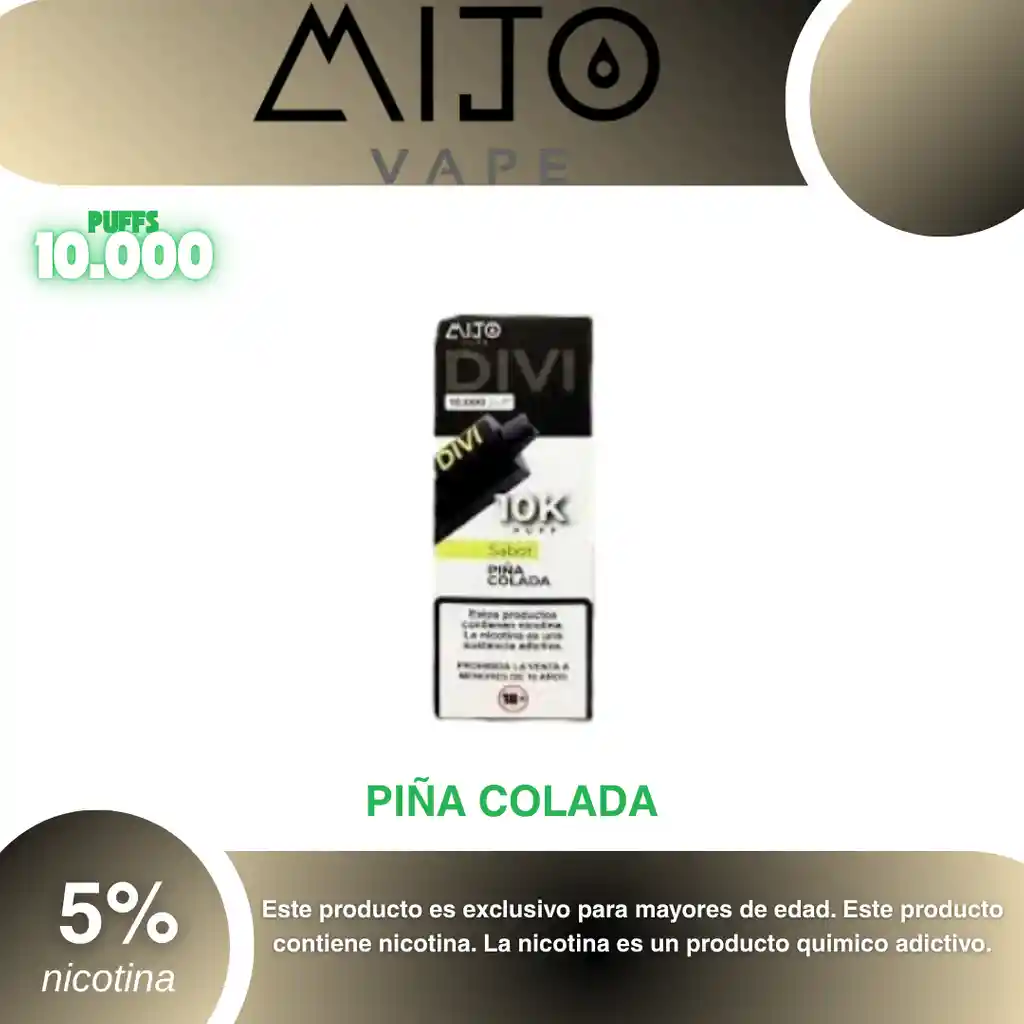 Mijo Divi 10.000 Puffs Piña colada 5% PROHIBIDA LA VENTA A MENORES DE EDAD. ADVERTENCIA: ESTE PRODUCTO CONTIENE NICOTINA, LA NICOTINA ES UNA SUSTANCIA QUIMICA ADICTIVA Y NOCIVA PARA LA SALUD. Los líquidos para vapeo contienen: propilenglicol USP, glicerina USP, sabor artificial y nicotina. Este producto puede contener nicotina, una sustancia altamente adictiva que puede generar dependencia, posibles afectaciones arteriales, cardiacas, pulmonares y otras aun no identificadas. No se recomienda su uso a mujeres en embarazo, puede generar lesiones al feto. Mantener alejado de niños y mascotas. No ingerir, puede generar irritación y/o intoxicación. Por favor antes de consumir consulte a su médico posibles afectaciones o sensibilidad a alguno de sus componentes. Los componentes de este producto pueden aumentar la sensación de ansiedad En caso de notar alguna reacción adversa por favor suspenda su uso de manera inmediata. Siga las instrucciones en el envase. No alterar sus componentes. Adquiera sus productos en sitios de confianza No use productos piratas, alterados, o en los cuales no pueda comprobar su buena procedencia, Verifique la reputación del fabricante y distribuidor antes de adquirir cualquier producto Si no es usuario fumador o vapeador no se recomienda su uso bajo ninguna circunstancia Al usar este producto usted es consciente que este producto puede generar afectaciones a su salud, incluyendo aquellas que a la fecha de la compra no se han identificado y que pueden aparecer a largo plazo