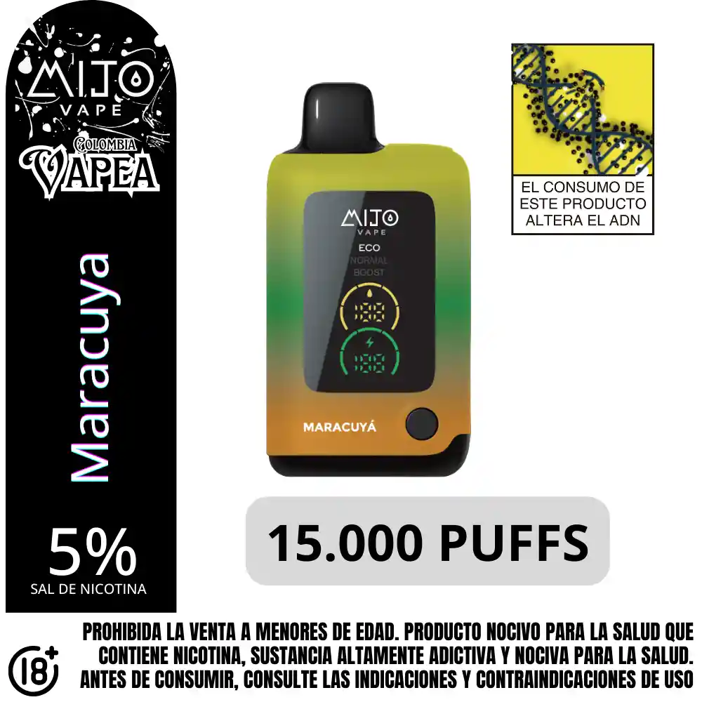 Vapeador Desechable marca Mijo sabor a Maracuya. Fuerza de nicotina: . Sal de nicotina equivalente a aproximadamente 1 paquete de cigarrillos. Capacidad de la batería: 500 mAh. Número de bocanadas: hasta 15000 Puffs o caladas. Prohibida la venta a menores de edad. Producto nocivo para la salud que contiene nicotina, sustancia altamente adictiva. Antes de consumir consulte las indicaciones y contraindicaciones de uso.