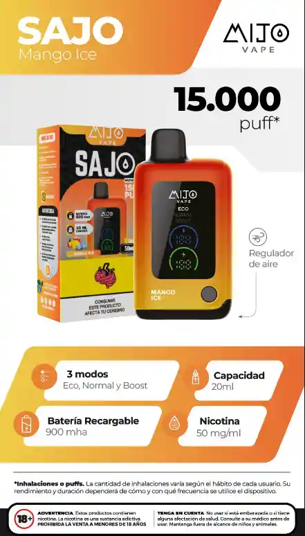 Características: Capacidad de líquido: 20 ml Batería: 650 mAh recargable Sales de nicotina: 50 mg (5%) Puffs: Hasta 15000 en modo ECO Cargador: USB tipo C (no incluido) Pantalla: Indica nivel de líquido y batería Contiene 1 unidad Material: Aluminio + PVC + Silicona 3 modos de potencia Ingredientes: Glicerina vegetal Propilenglicol Sabores naturales y sabores artificiales Ácido benzoico Nicotina 50mg (5%) Este es un equipo desechable, puedes recargar su batería interna con un cargador de 1 amperio pero cuando se te acabe el líquido éste no puedes rellenarlo, es hora de desecharlo. Contenido del Paquete: 1 x Mijo Sajo hasta 15.000 Puff en modo ECO (prellenado con 20 ml de e-líquido de sales de nicotina). Advertencias y Recomendaciones de Uso: Uso exclusivo con e-líquido prellenado. No intentar rellenar el dispositivo ni modificarlo. Mantenimiento: No es necesario realizar mantenimiento. Una vez que se ha agotado el e-líquido o la batería, desechar el dispositivo de manera adecuada. Precauciones de Seguridad: Mantén el dispositivo fuera del alcance de niños y mascotas. No expongas el dispositivo a temperaturas extremas ni a la luz solar directa. Evita el contacto con el e-líquido. Producto exclusivo para mayores de edad: Este producto contiene nicotina, una sustancia adictiva. Es solo para adultos mayores de edad. Cargar únicamente con el cable USB Tipo-C adecuado. No utilices cargadores de alta potencia para evitar sobrecalentamientos. No desmontar o modificar: Este dispositivo está diseñado para ser desechado una vez que se agote el e-líquido o la batería. No debe ser recargado o reutilizado más allá de lo especificado.