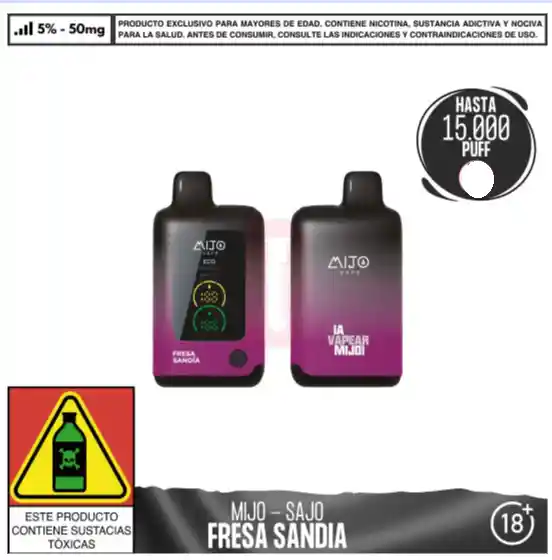 Disfruta de hasta 15.000 caladas llenas de sabor con el nuevo Vape Mijo, un dispositivo diseñado para durar y acompañarte en cualquier momento. 🍓 Fresa Sandía – dulce y refrescante Capacidad: 20 ml de e-liquid Duración: 15.000 puffs Batería recargable USB-C Caladas suaves y consistentes Diseño moderno y ergonómico