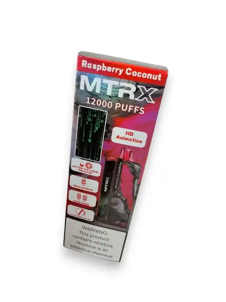 Disfrutá una experiencia suave y llena de sabor con el MTRX de 12.000 puffs, combinación deliciosa de frambuesa con coco. Este modelo viene con pantalla animada en HD y funciones que mejoran cada calada, ideal para quienes buscan comodidad y duración.