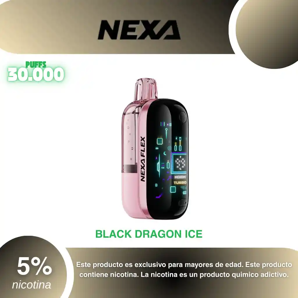 Vape Nexa Flex 30.000 Puffs Sabor Mora con Fruta del Dragon Mentolado 5% PROHIBIDA LA VENTA A MENORES DE EDAD. ADVERTENCIA: ESTE PRODUCTO CONTIENE NICOTINA, LA NICOTINA ES UNA SUSTANCIA QUIMICA ADICTIVA Y NOCIVA PARA LA SALUD. Los líquidos para vapeo contienen: propilenglicol USP, glicerina USP, sabor artificial y nicotina. Este producto puede contener nicotina, una sustancia altamente adictiva que puede generar dependencia, posibles afectaciones arteriales, cardiacas, pulmonares y otras aun no identificadas. No se recomienda su uso a mujeres en embarazo, puede generar lesiones al feto. Mantener alejado de niños y mascotas. No ingerir, puede generar irritación y/o intoxicación. Por favor antes de consumir consulte a su médico posibles afectaciones o sensibilidad a alguno de sus componentes. Los componentes de este producto pueden aumentar la sensación de ansiedad En caso de notar alguna reacción adversa por favor suspenda su uso de manera inmediata. Siga las instrucciones en el envase. No alterar sus componentes. Adquiera sus productos en sitios de confianza No use productos piratas, alterados, o en los cuales no pueda comprobar su buena procedencia, Verifique la reputación del fabricante y distribuidor antes de adquirir cualquier producto Si no es usuario fumador o vapeador no se recomienda su uso bajo ninguna circunstancia Al usar este producto usted es consciente que este producto puede generar afectaciones a su salud, incluyendo aquellas que a la fecha de la compra no se han identificado y que pueden aparecer a largo plazo