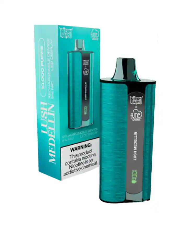 Vaporizador Nicky Jam x Fume Lush Medellin Sandia mentolado, 10.000 puffs recargable 5% nic, cuenta con pantalla, medidor de batería y medidor de esencia.