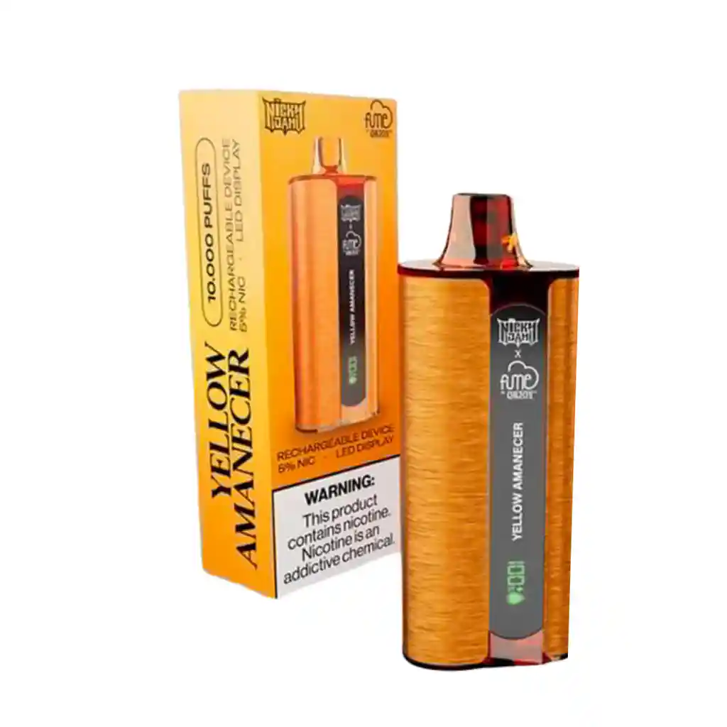 Vaporizador Nicky Jam x Fume Yellow Amanecer Mango Banana Piña, 10.000 puffs recargable 5% nic, cuenta con pantalla, medidor de batería y medidor de esencia.