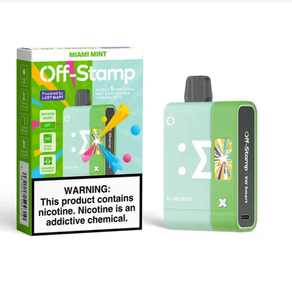 MIAMI MINT. Kit Bateria reutilizable y Pod de 16.000 Puffs. Indicador de bateria, puerto de carga tipo C. 5% Nicotina. Pantalla interactiva. BY LOST MARY.