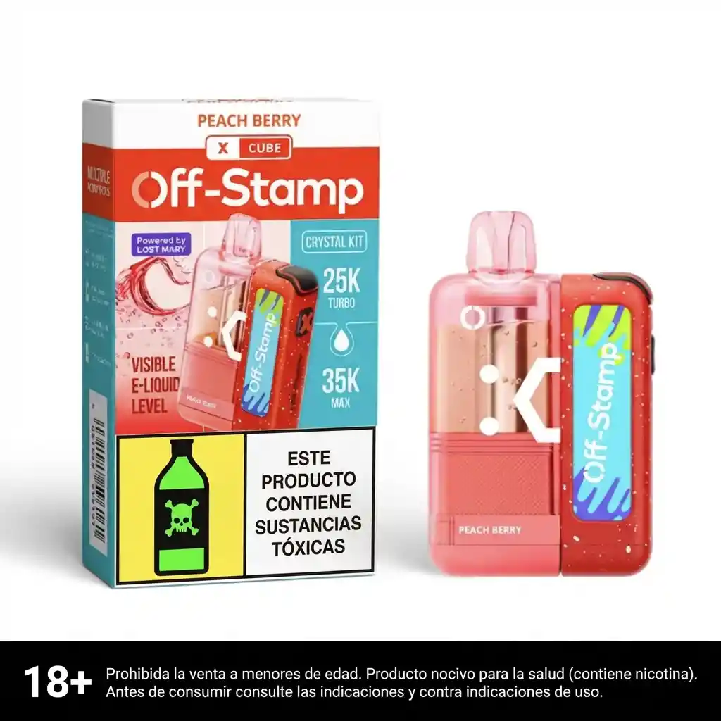 DURAZNO Y MORA. La bateria es reutilizable. Off-Stamp X-Cube Raspberry Watermelon cuenta con 17 mL de e-liquid, 5% de nicotina (50 mg) y hasta 35.000 puffs. Integra dispositivo inteligente recargable, pantalla HD interactiva de 2.25”, modos de potencia ajustables, dual mesh coil para mejor sabor, batería total de 1100 mAh con carga rápida USB-C.