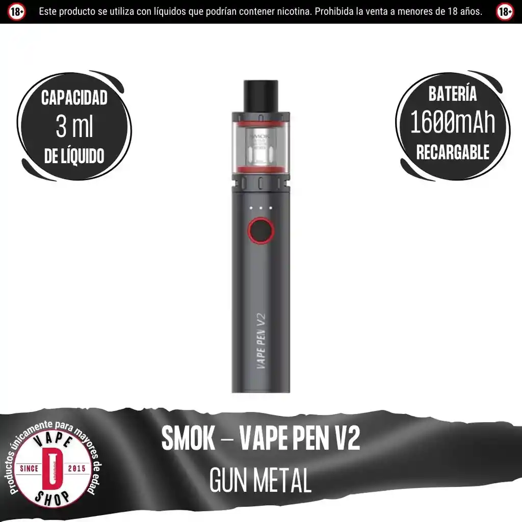 Como el último vape estilo bolígrafo de la serie SMOK Vape Pen para uso de liquidos base libre, el kit de inicio SMOK Vape Pen V2 es un kit de inicio portátil todo en uno estilo bolígrafo con diseño ergonómico. El Vape Pen V2 viene con una nueva bobina de cerámica Vape Pen Meshed de 0.15ohm para un sabor óptimo y nubes masivas. Junto con la salida directa de un máximo de 60 W, el SMOK Vape Pen V2 le brindará un vapeo estable y sorprendente con múltiples protecciones. Y también adopta un botón de disparo simple, lo que facilita mucho la operación. Simplemente obtenga el SMOK Vape Pen V2 compacto y portátil para un excelente vapeo. Las ranuras de aire inferiores en ambos tamaños brindan un AFC equilibrado a las bobinas. El indicador LED de 3 colores también muestra claramente la duración de la batería. Especificaciones: Diseño portátil estilo bolígrafo Potente batería incorporada de 1600 mAh Bobinas de malla innovadoras Vape Pen Indicador LED de tres colores AFC de fondo ancho para un flujo de aire equilibrado Múltiples protecciones garantizan un vapeo seguro. Características: Tamaño: 117,7 x 22 mm Capacidad de la batería: 1600 mAh Potencia máxima: 60 W Voltaje de entrada: 3,3 V-4,2 V ± 0,2 V Voltaje de salida: 3,0 V-4,0 V Corriente en espera: 50uA Rango de resistencia de carga: 0.14ohm-3.0ohm Corriente de carga: Max 670mA Voltaje de carga: 4,2 V ± 0,2 V Voltaje de sobrecarga: 4,3 V + 0,05 V Voltaje de sobredescarga: 2,4 V ± 0,05 V Corriente de sobrecarga: 1.7A + 0.6A Incluye: 1 x dispositivo VAPE PEN V2 2 bobinas de 0.15ohm de malla VAPE PEN 1 x cable USB 1 x manual de usuario Venta exclusiva para mayores de 18 años