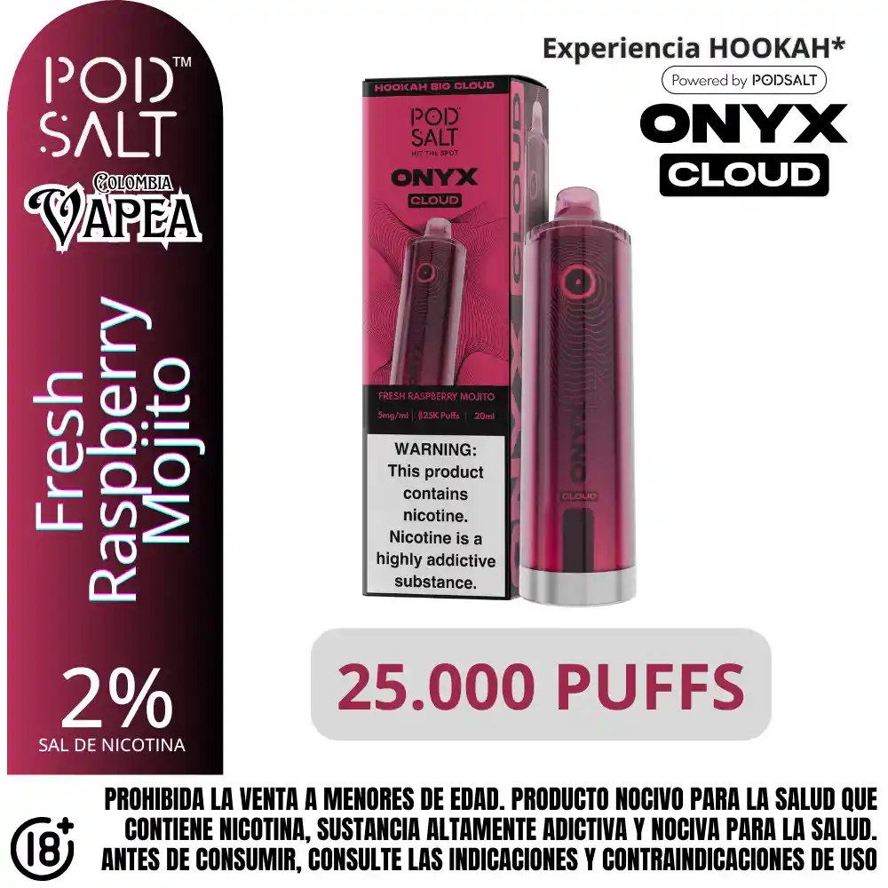 Vapeador Desechable marca Podsalt sabor a Fresh Raspberry Mojito. Fuerza de nicotina: 2%. Sal de nicotina equivalente a aproximadamente 1 paquete de cigarrillos. Capacidad de la batería: 1000 mAh. Número de bocanadas: hasta 25000 Puffs o caladas. Prohibida la venta a menores de edad. Producto nocivo para la salud que contiene nicotina, sustancia altamente adictiva. Antes de consumir consulte las indicaciones y contraindicaciones de uso.