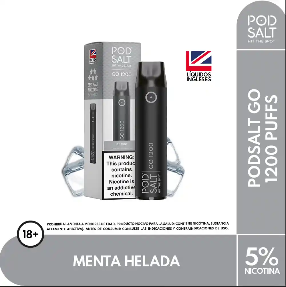 Vapeador Desechable marca Podsalt sabor a Ice Mint. Fuerza de nicotina: 5%. Sal de nicotina equivalente a aproximadamente 1 paquete de cigarrillos. Capacidad de la batería: 500 mAh. Número de bocanadas: hasta 1200 Puffs o caladas. Prohibida la venta a menores de edad. Producto nocivo para la salud que contiene nicotina, sustancia altamente adictiva. Antes de consumir consulte las indicaciones y contraindicaciones de uso.