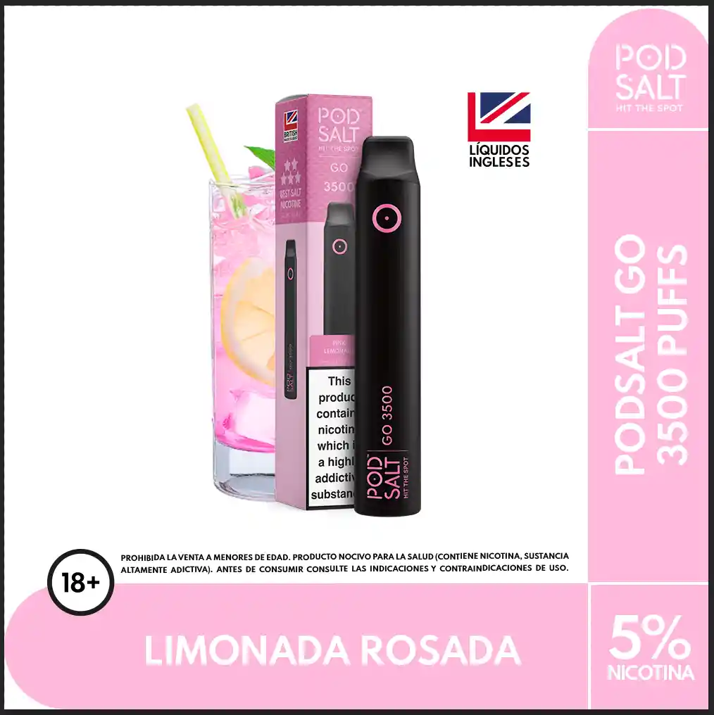 Vapeador Desechable marca Podsalt sabor a Pink Lemonade. Fuerza de nicotina: 5%. Sal de nicotina equivalente a aproximadamente 1 paquete de cigarrillos. Capacidad de la batería: 500 mAh. Número de bocanadas: hasta 3500 Puffs o caladas. Prohibida la venta a menores de edad. Producto nocivo para la salud que contiene nicotina, sustancia altamente adictiva. Antes de consumir consulte las indicaciones y contraindicaciones de uso.