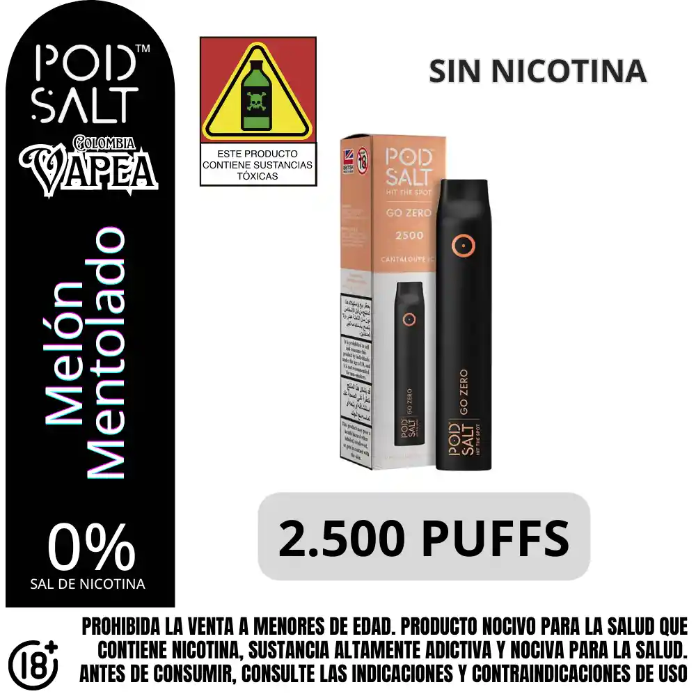 Vapeador Desechable marca Podsalt sabor a Zero Cantaloupe ice. Fuerza de nicotina: 0%. Sal de nicotina equivalente a aproximadamente 1 paquete de cigarrillos. Capacidad de la batería: 500 mAh. Número de bocanadas: hasta 2500 Puffs o caladas. Prohibida la venta a menores de edad. Producto nocivo para la salud que contiene nicotina, sustancia altamente adictiva. Antes de consumir consulte las indicaciones y contraindicaciones de uso.