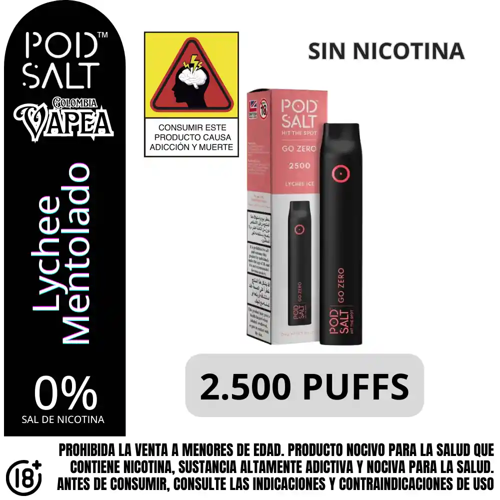 Vapeador Desechable marca Podsalt sabor a Zero Lychee Ice. Fuerza de nicotina: 0%. Sal de nicotina equivalente a aproximadamente 1 paquete de cigarrillos. Capacidad de la batería: 500 mAh. Número de bocanadas: hasta 2500 Puffs o caladas. Prohibida la venta a menores de edad. Producto nocivo para la salud que contiene nicotina, sustancia altamente adictiva. Antes de consumir consulte las indicaciones y contraindicaciones de uso.