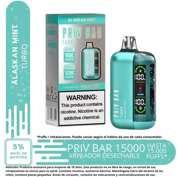15k puff, modo turbo, dispositivo desechable, bateria recargable de 800mAh, 16ml / 5% nicotin - indicador de carga y liquido