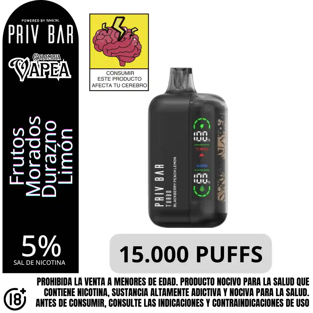 Vapeador Desechable marca Priv Bar sabor a Blackberry peach Lemon. Fuerza de nicotina: 5%. Sal de nicotina equivalente a aproximadamente 1 paquete de cigarrillos. Capacidad de la batería: 500 mAh. Número de bocanadas: hasta 15000 Puffs o caladas. Prohibida la venta a menores de edad. Producto nocivo para la salud que contiene nicotina, sustancia altamente adictiva. Antes de consumir consulte las indicaciones y contraindicaciones de uso.