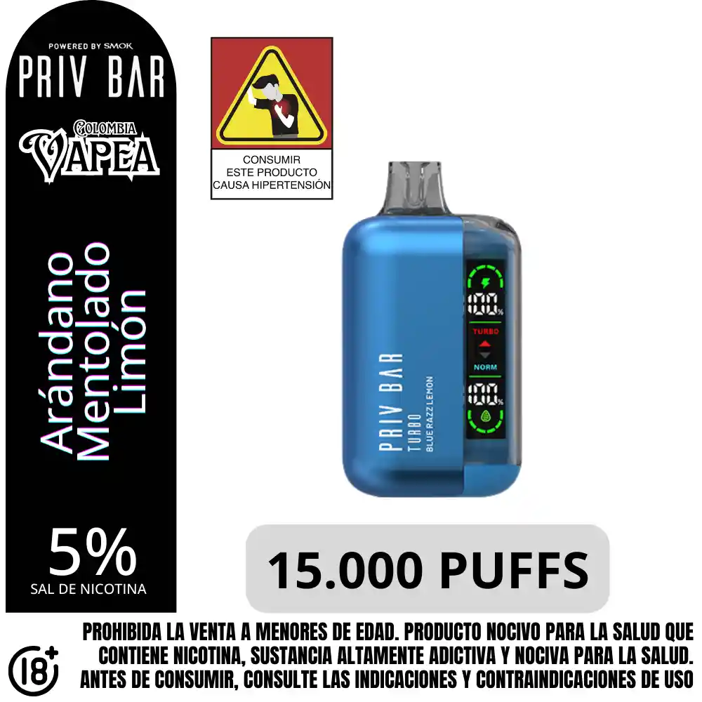 Vapeador Desechable marca Priv Bar sabor a Blue Razz Lemon. Fuerza de nicotina: 5%. Sal de nicotina equivalente a aproximadamente 1 paquete de cigarrillos. Capacidad de la batería: 500 mAh. Número de bocanadas: hasta 15000 Puffs o caladas. Prohibida la venta a menores de edad. Producto nocivo para la salud que contiene nicotina, sustancia altamente adictiva. Antes de consumir consulte las indicaciones y contraindicaciones de uso.