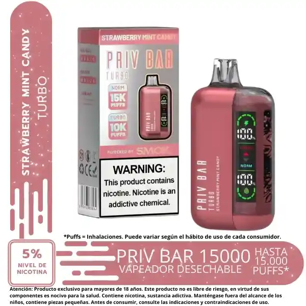 15k puff, modo turbo, dispositivo desechable, bateria recargable de 800mAh, 16ml / 5% nicotin - indicador de carga y liquido