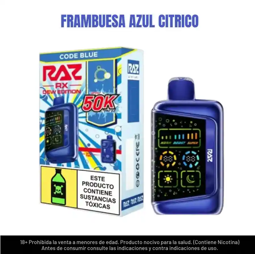 FRAMBUESA AZUL CITRICO - Vape Raz 50.000 Puffs, con 3 modos de uso, normal, boost y super boost. 5% nicotina, prohibida su venta a menores de edad, este producto contiene nicotina.