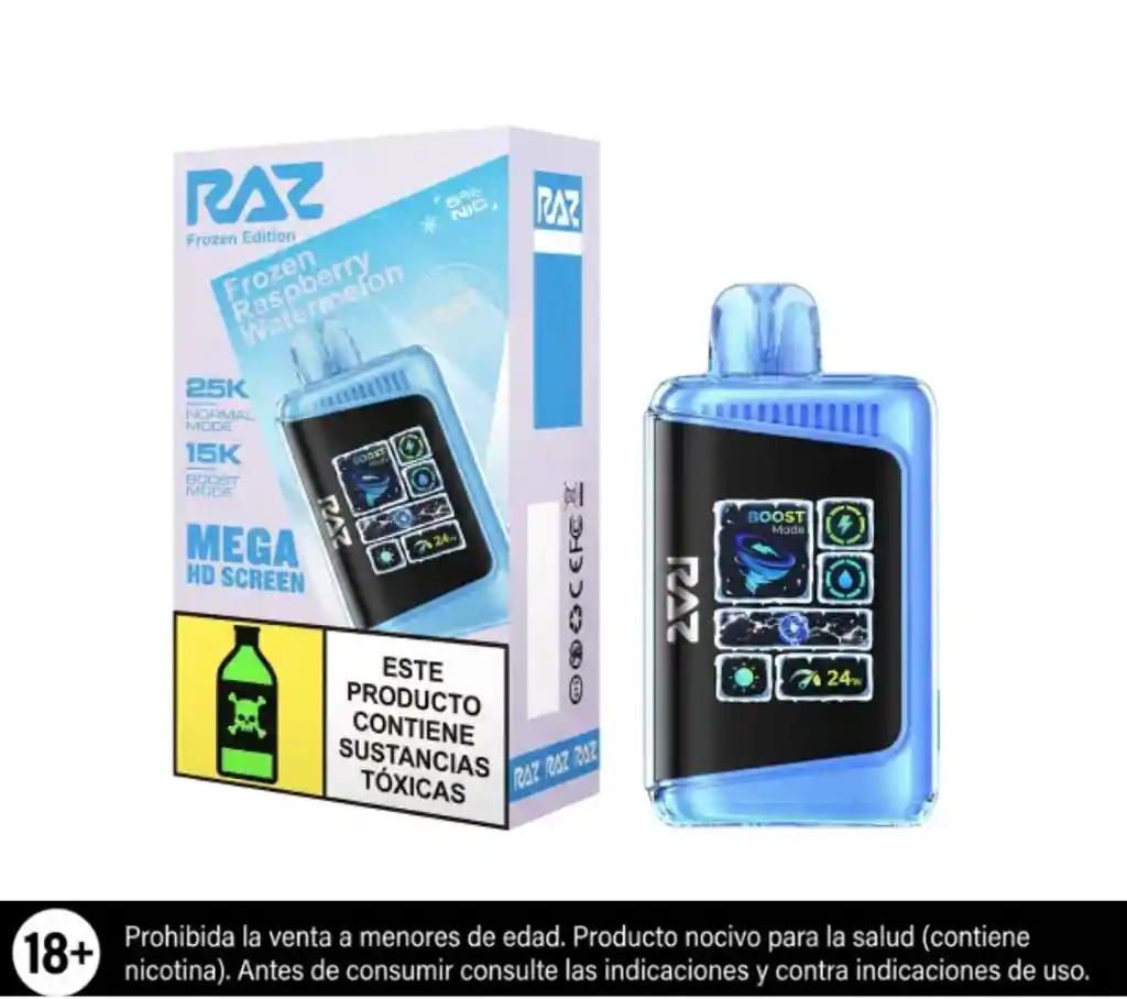 FRAMBUESA SANDIA MENTOLADO. Vaporizador desechable. CON 2 MODOS DE POTENCIA. Pantalla con indicador de bateria y esencia. Contiene 1 unidad con bateria recargable, recargado hasta con 25.000 puffs en modo regular y 15.000 puffs en modo Pulse. Nicotina 5% . Producto exclusivo para mayores de edad, contiene nicotina, la nicotina es adictiva.