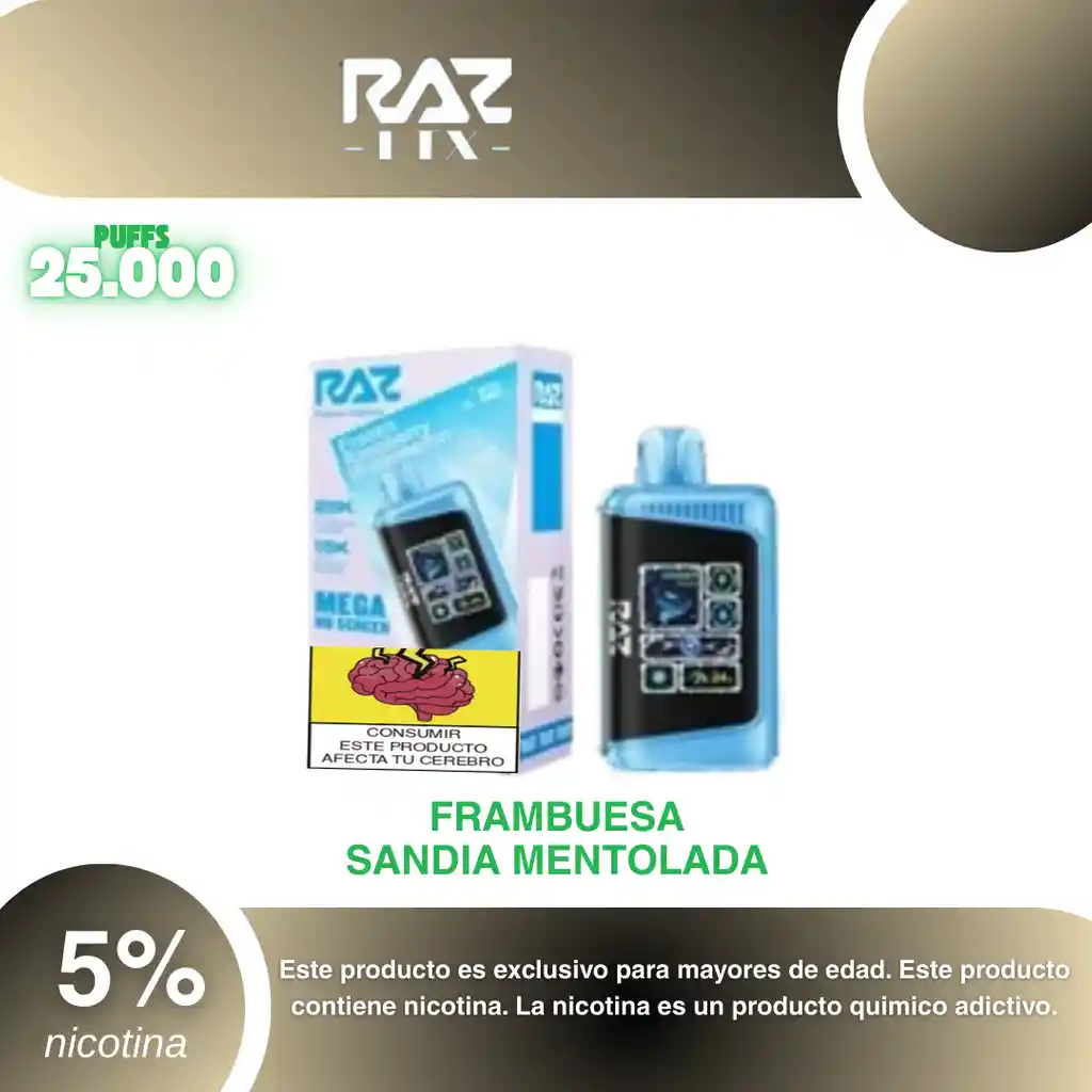 Raz Ltx 25.000 Puffs, Frambuesa Sandia 5% PROHIBIDA LA VENTA A MENORES DE EDAD. ADVERTENCIA: ESTE PRODUCTO CONTIENE NICOTINA, LA NICOTINA ES UNA SUSTANCIA QUIMICA ADICTIVA Y NOCIVA PARA LA SALUD. Los líquidos para vapeo contienen: propilenglicol USP, glicerina USP, sabor artificial y nicotina. Este producto puede contener nicotina, una sustancia altamente adictiva que puede generar dependencia, posibles afectaciones arteriales, cardiacas, pulmonares y otras aun no identificadas. No se recomienda su uso a mujeres en embarazo, puede generar lesiones al feto. Mantener alejado de niños y mascotas. No ingerir, puede generar irritación y/o intoxicación. Por favor antes de consumir consulte a su médico posibles afectaciones o sensibilidad a alguno de sus componentes. Los componentes de este producto pueden aumentar la sensación de ansiedad En caso de notar alguna reacción adversa por favor suspenda su uso de manera inmediata. Siga las instrucciones en el envase. No alterar sus componentes. Adquiera sus productos en sitios de confianza No use productos piratas, alterados, o en los cuales no pueda comprobar su buena procedencia, Verifique la reputación del fabricante y distribuidor antes de adquirir cualquier producto Si no es usuario fumador o vapeador no se recomienda su uso bajo ninguna circunstancia Al usar este producto usted es consciente que este producto puede generar afectaciones a su salud, incluyendo aquellas que a la fecha de la compra no se han identificado y que pueden aparecer a largo plazo.