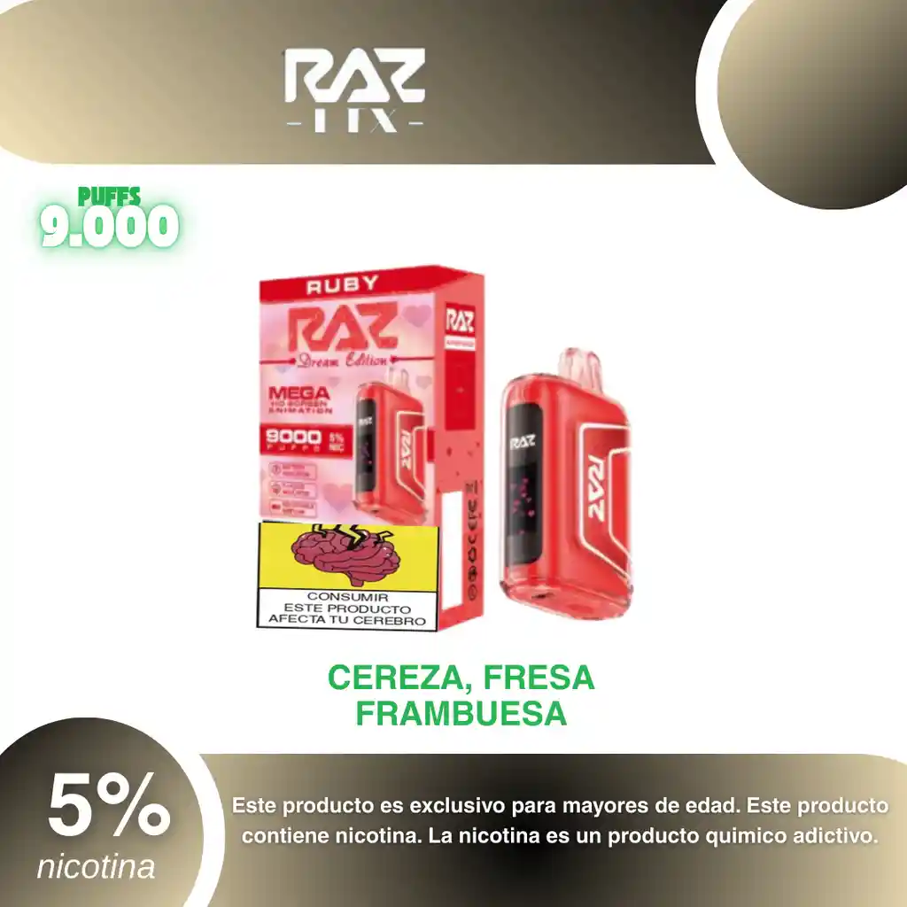 Raz Tn 9.000 Puffs, Sabor Frambuesa, Fresa y Cereza 5% PROHIBIDA LA VENTA A MENORES DE EDAD. ADVERTENCIA: ESTE PRODUCTO CONTIENE NICOTINA, LA NICOTINA ES UNA SUSTANCIA QUIMICA ADICTIVA Y NOCIVA PARA LA SALUD. Los líquidos para vapeo contienen: propilenglicol USP, glicerina USP, sabor artificial y nicotina. Este producto puede contener nicotina, una sustancia altamente adictiva que puede generar dependencia, posibles afectaciones arteriales, cardiacas, pulmonares y otras aun no identificadas. No se recomienda su uso a mujeres en embarazo, puede generar lesiones al feto. Mantener alejado de niños y mascotas. No ingerir, puede generar irritación y/o intoxicación. Por favor antes de consumir consulte a su médico posibles afectaciones o sensibilidad a alguno de sus componentes. Los componentes de este producto pueden aumentar la sensación de ansiedad En caso de notar alguna reacción adversa por favor suspenda su uso de manera inmediata. Siga las instrucciones en el envase. No alterar sus componentes. Adquiera sus productos en sitios de confianza No use productos piratas, alterados, o en los cuales no pueda comprobar su buena procedencia, Verifique la reputación del fabricante y distribuidor antes de adquirir cualquier producto Si no es usuario fumador o vapeador no se recomienda su uso bajo ninguna circunstancia Al usar este producto usted es consciente que este producto puede generar afectaciones a su salud, incluyendo aquellas que a la fecha de la compra no se han identificado y que pueden aparecer a largo plazo