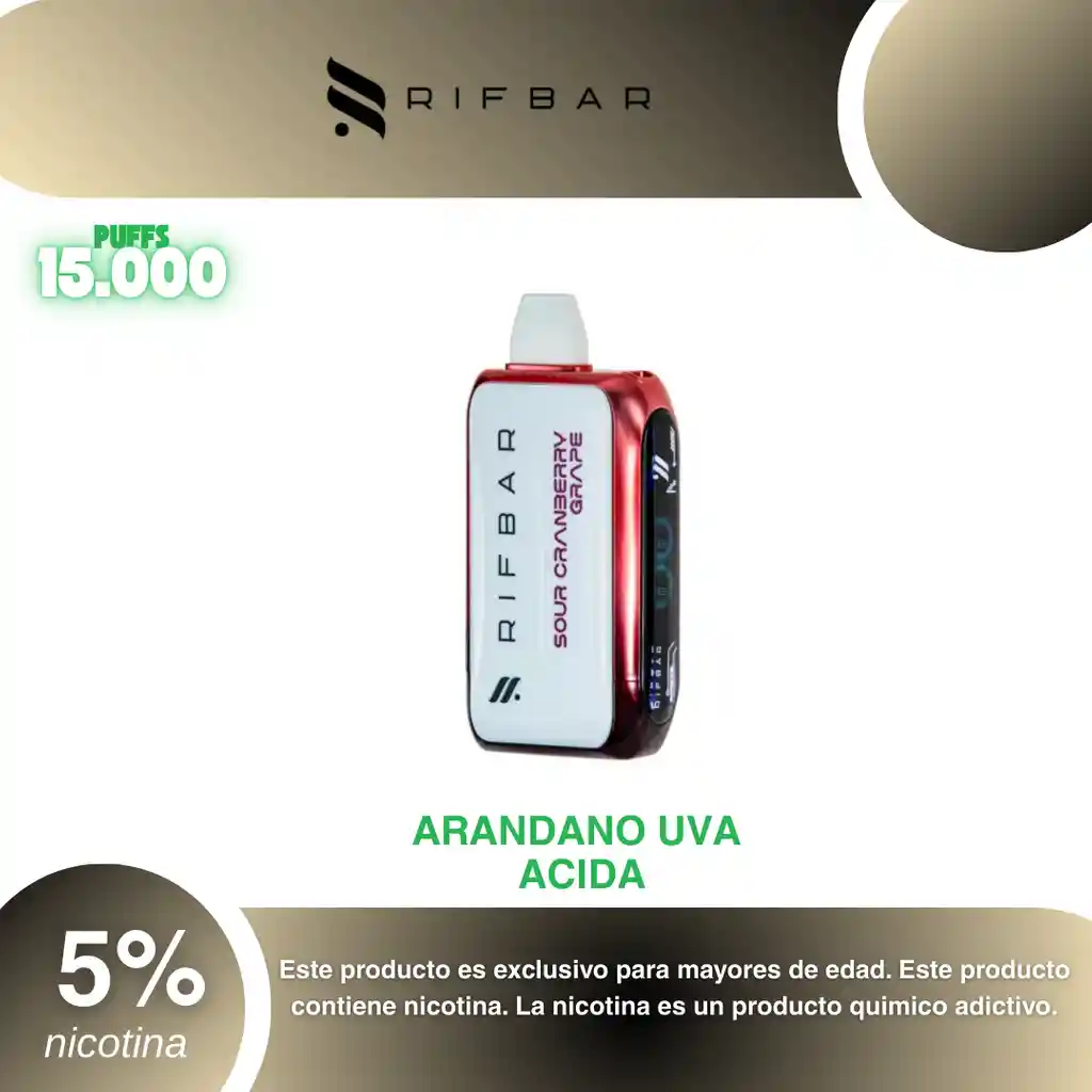 Rifbar Turbo X 15.000 Puffs, Sabor Cranberry Uva 5% PROHIBIDA LA VENTA A MENORES DE EDAD. ADVERTENCIA: ESTE PRODUCTO CONTIENE NICOTINA, LA NICOTINA ES UNA SUSTANCIA QUIMICA ADICTIVA Y NOCIVA PARA LA SALUD. Los líquidos para vapeo contienen: propilenglicol USP, glicerina USP, sabor artificial y nicotina. Este producto puede contener nicotina, una sustancia altamente adictiva que puede generar dependencia, posibles afectaciones arteriales, cardiacas, pulmonares y otras aun no identificadas. No se recomienda su uso a mujeres en embarazo, puede generar lesiones al feto. Mantener alejado de niños y mascotas. No ingerir, puede generar irritación y/o intoxicación. Por favor antes de consumir consulte a su médico posibles afectaciones o sensibilidad a alguno de sus componentes. Los componentes de este producto pueden aumentar la sensación de ansiedad En caso de notar alguna reacción adversa por favor suspenda su uso de manera inmediata. Siga las instrucciones en el envase. No alterar sus componentes. Adquiera sus productos en sitios de confianza No use productos piratas, alterados, o en los cuales no pueda comprobar su buena procedencia, Verifique la reputación del fabricante y distribuidor antes de adquirir cualquier producto Si no es usuario fumador o vapeador no se recomienda su uso bajo ninguna circunstancia Al usar este producto usted es consciente que este producto puede generar afectaciones a su salud, incluyendo aquellas que a la fecha de la compra no se han identificado y que pueden aparecer a largo plazo
