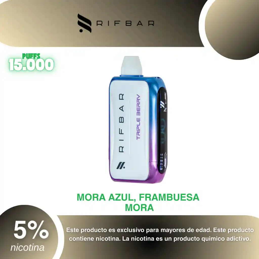 Rifbar Turbo X 15.000 Puffs, Sabor Frutos Rojos 5% PROHIBIDA LA VENTA A MENORES DE EDAD. ADVERTENCIA: ESTE PRODUCTO CONTIENE NICOTINA, LA NICOTINA ES UNA SUSTANCIA QUIMICA ADICTIVA Y NOCIVA PARA LA SALUD. Los líquidos para vapeo contienen: propilenglicol USP, glicerina USP, sabor artificial y nicotina. Este producto puede contener nicotina, una sustancia altamente adictiva que puede generar dependencia, posibles afectaciones arteriales, cardiacas, pulmonares y otras aun no identificadas. No se recomienda su uso a mujeres en embarazo, puede generar lesiones al feto. Mantener alejado de niños y mascotas. No ingerir, puede generar irritación y/o intoxicación. Por favor antes de consumir consulte a su médico posibles afectaciones o sensibilidad a alguno de sus componentes. Los componentes de este producto pueden aumentar la sensación de ansiedad En caso de notar alguna reacción adversa por favor suspenda su uso de manera inmediata. Siga las instrucciones en el envase. No alterar sus componentes. Adquiera sus productos en sitios de confianza No use productos piratas, alterados, o en los cuales no pueda comprobar su buena procedencia, Verifique la reputación del fabricante y distribuidor antes de adquirir cualquier producto Si no es usuario fumador o vapeador no se recomienda su uso bajo ninguna circunstancia Al usar este producto usted es consciente que este producto puede generar afectaciones a su salud, incluyendo aquellas que a la fecha de la compra no se han identificado y que pueden aparecer a largo plazo