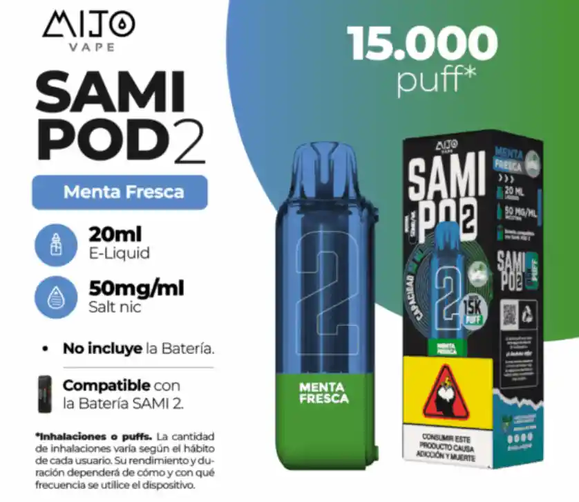 Sami Pod 2 — sabor intenso y vaporización prolongada sin complicaciones. Hasta 15 000 puffs con e-líquido precargado de 20 ml y 5 % nicotina para una experiencia consistente y sin recargas. Plug-and-play: cambia el pod en segundos y sigue disfrutando. Sabor: Menta Fresca