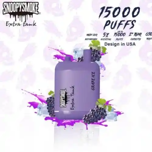 ¡Potencia y frescura en cada calada! El Snoopy Smoke Extra Tank llega con su sistema de doble tanque independiente, diseñado para ofrecerte hasta 15,000 puffs con un sabor que no pierde intensidad de principio a fin. Sabor: Grape Ice (Uva Intensa y Hielo). Capacidad: 15,000 inhalaciones aproximadamente. Tecnología: Dos tanques de almacenamiento para mayor durabilidad. Batería: Recargable de 650 mAh vía USB-C. Estilo: Portátil, ergonómico y de activación inmediata.